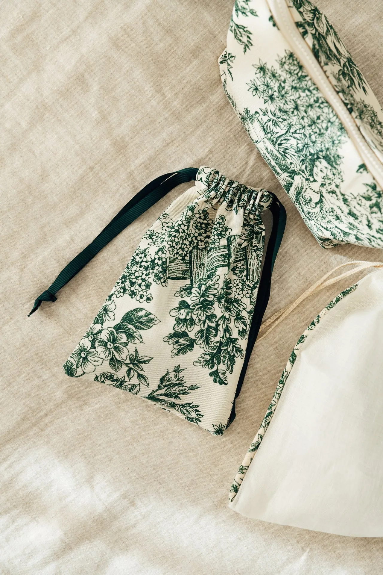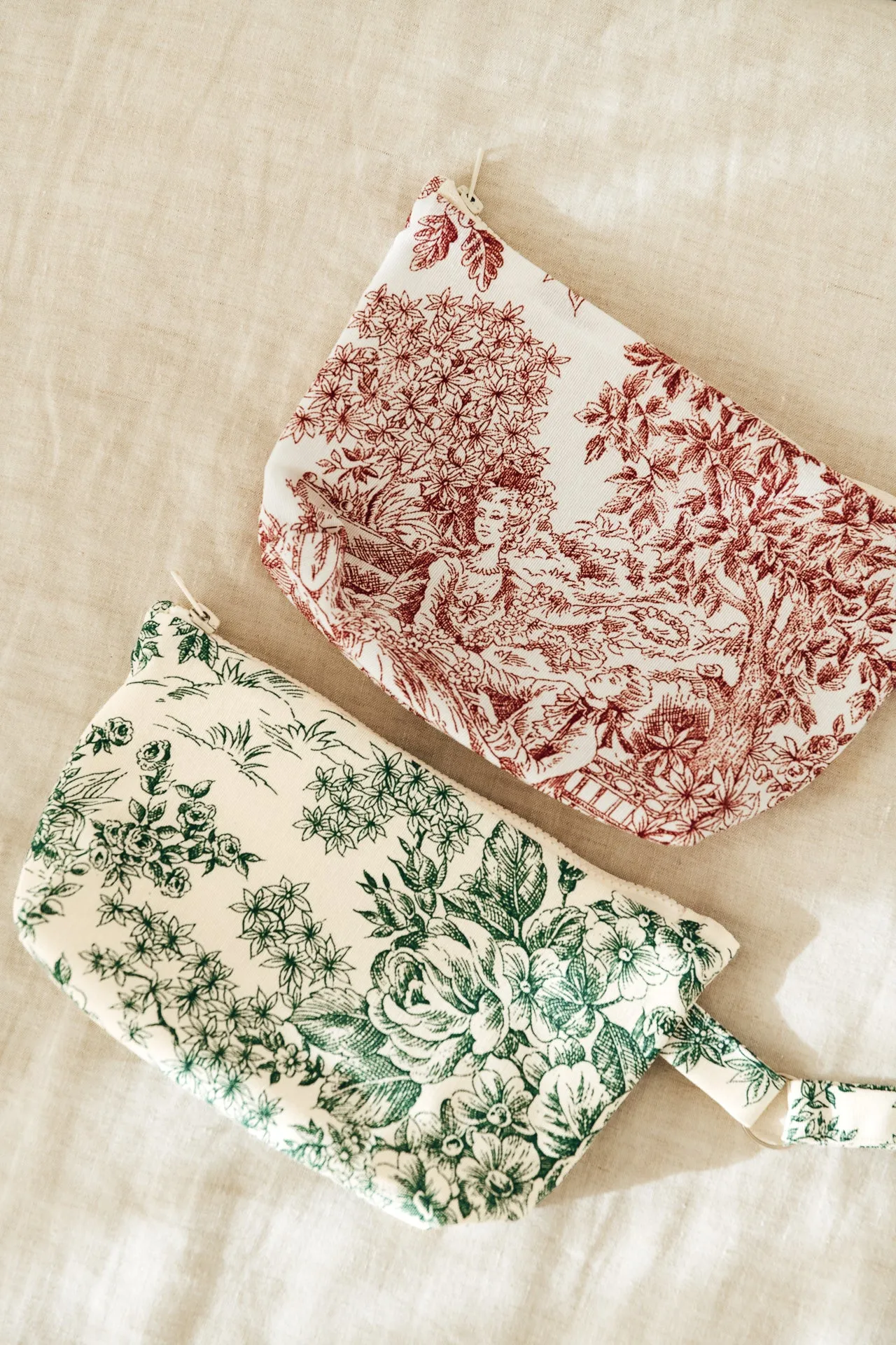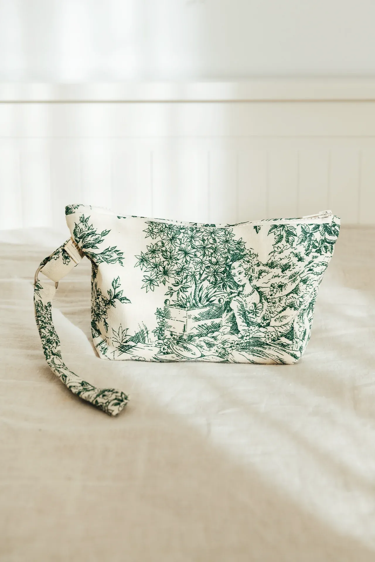 Nuestro neceser personalizado tiene el tamaño ideal para meter todo lo que necesitas. Es de doble tela pero moldeable para que se adapte al contenido. Con tejido Toile de Jouy, con asa y gran capacidad.