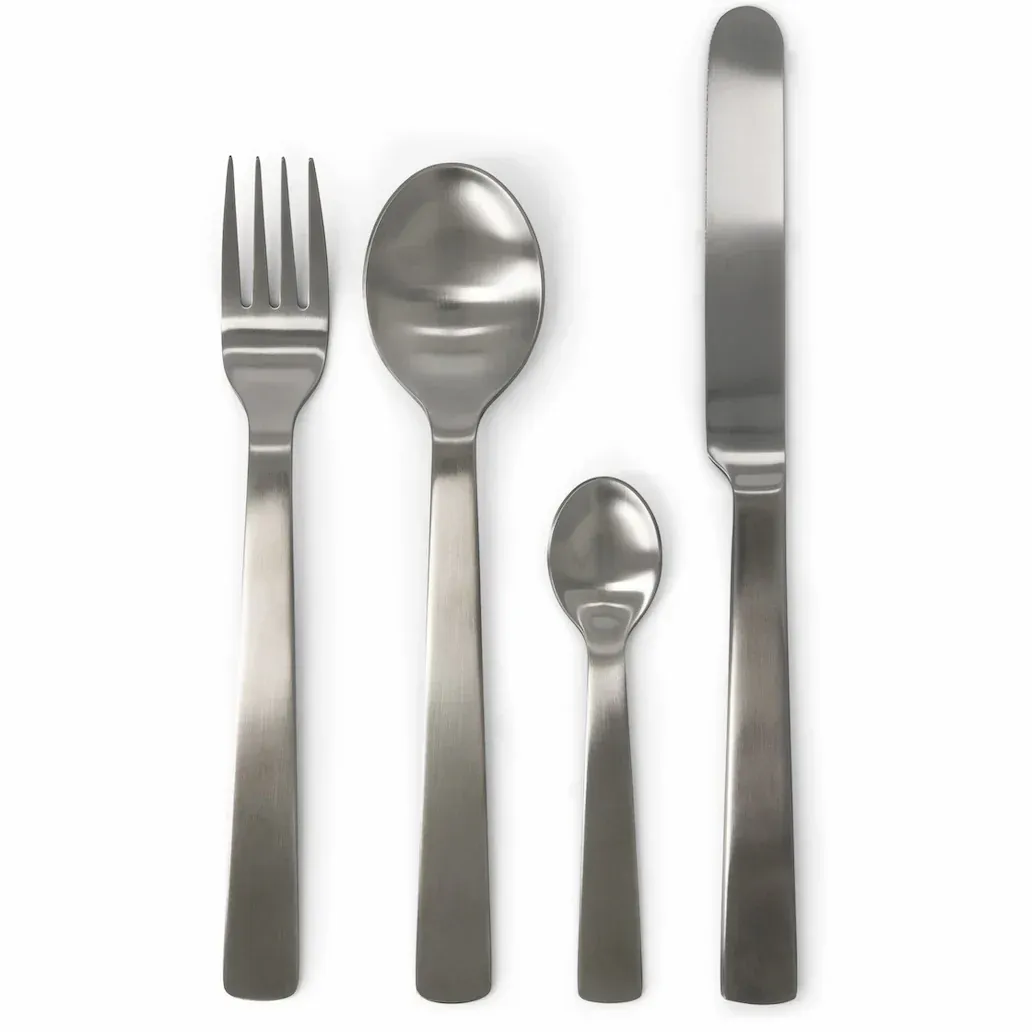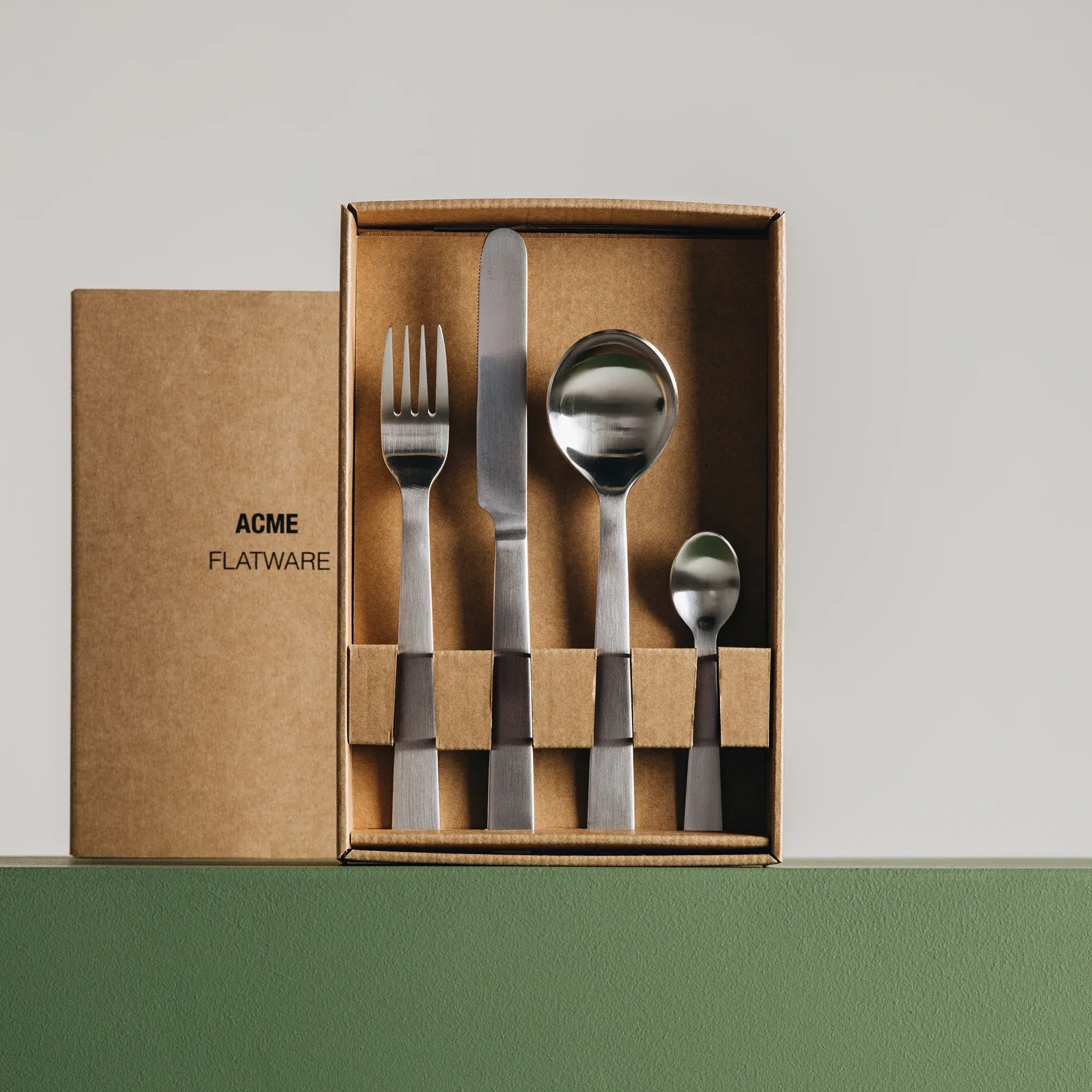 Pack de 24 piezas de cubertería mixta ACME de diseño vanguardista. Fabricados en acero inoxidable cepillado, nuestros cubiertos son durables, sólidos y están diseñados para verse mejor con la edad.