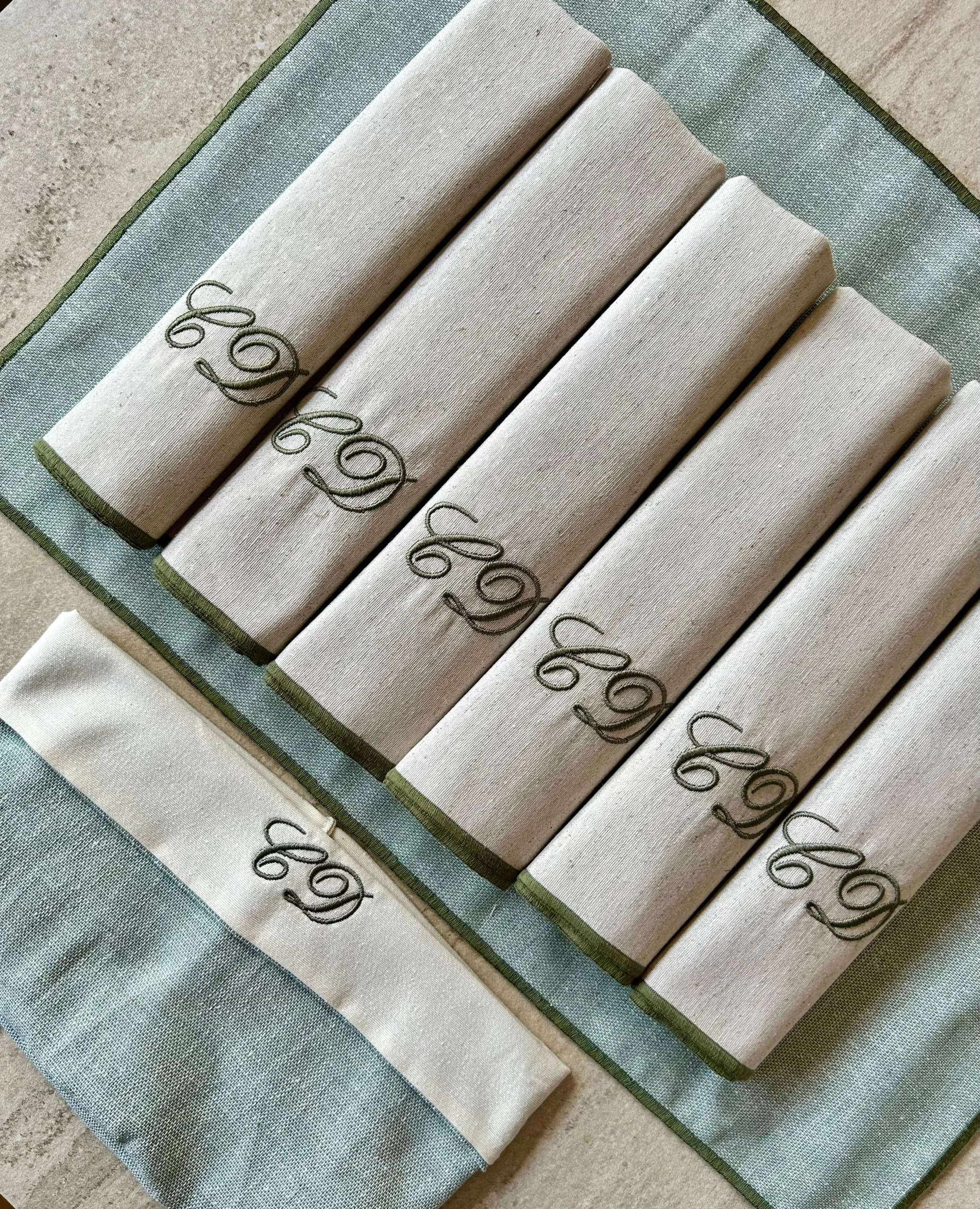 Pack compuesto de cesta, 6 Servilletas Cuca verde Oliva y 6 Individuales Salitre Verde personalizados.