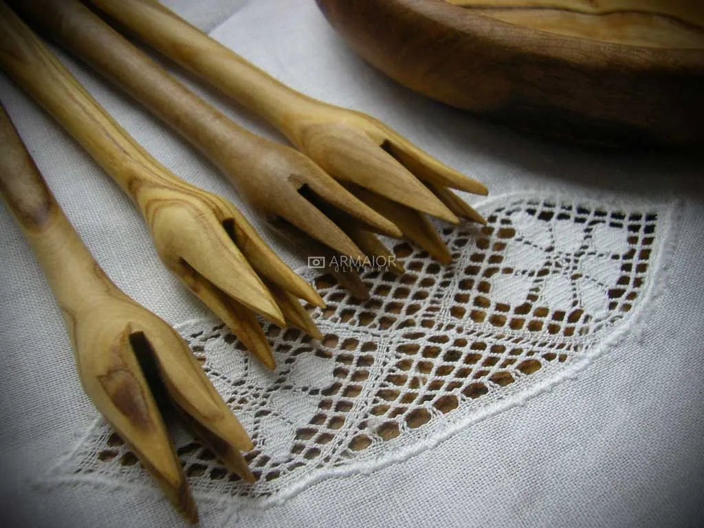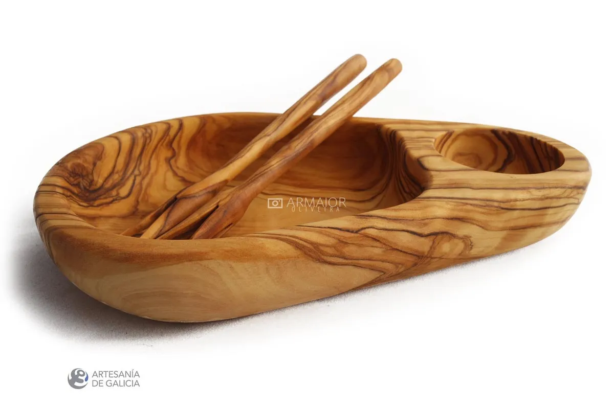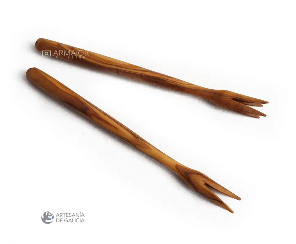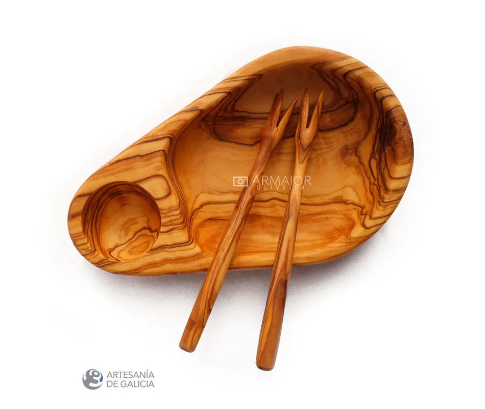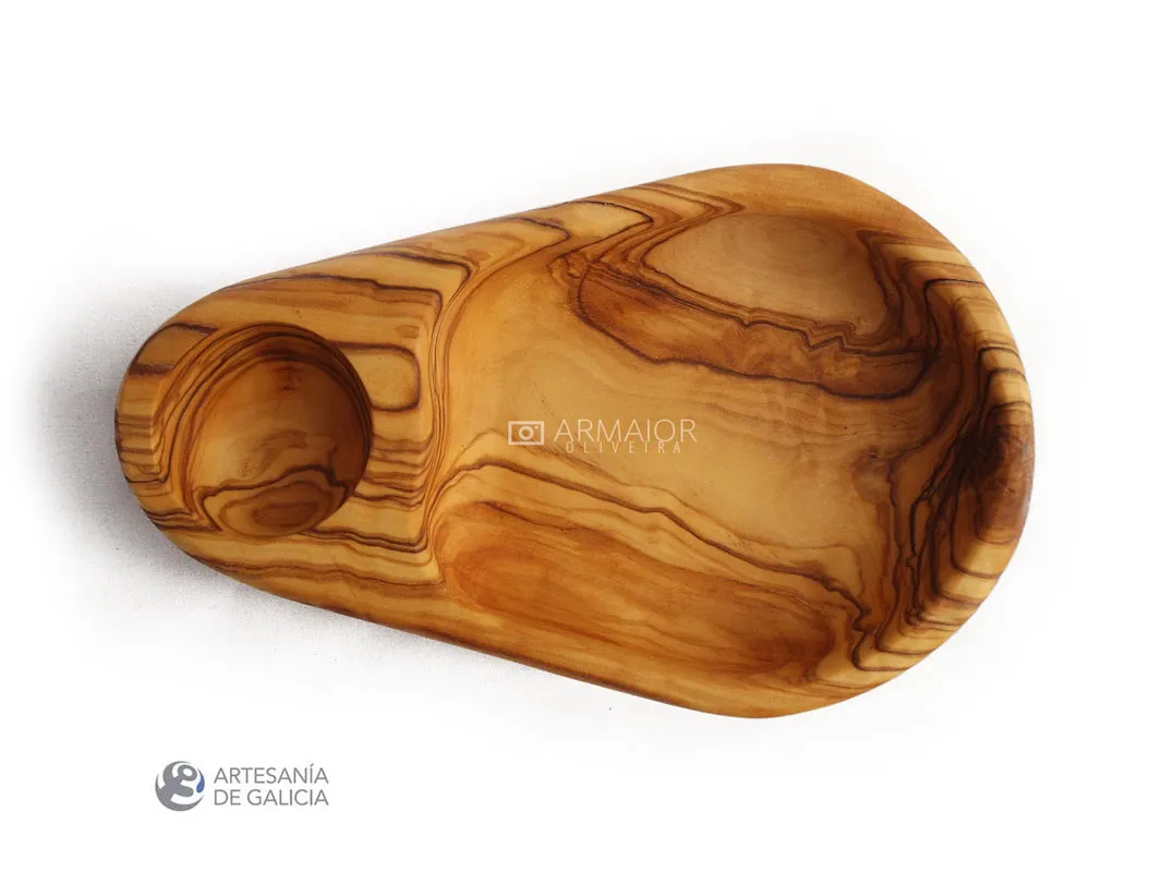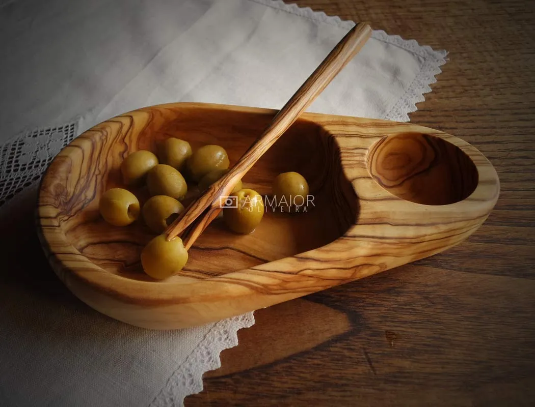 Pack compuesto de plato y pinchos para las aceitunas en madera de olivo. Plato con dos compartimentos, uno para las aceitunas y otro para dejar los huesos. Y dos pinchos con cuatro puntas o dientes que aseguran el agarre impidiendo que la aceituna se mueva por el plato. Con un solo gesto pinchamos la aceituna con limpieza y facilidad. Para disfrutar del aperitivo en solitario o con amigos. Con todas las características que hacen de la madera de olivo una de las más recomendadas para usar en la cocina:
