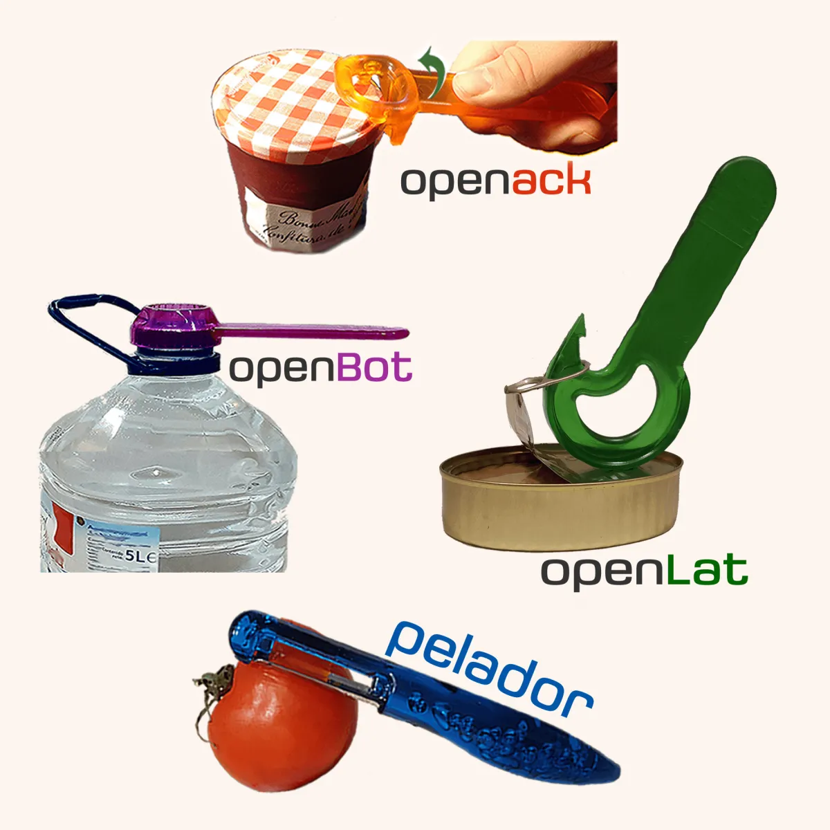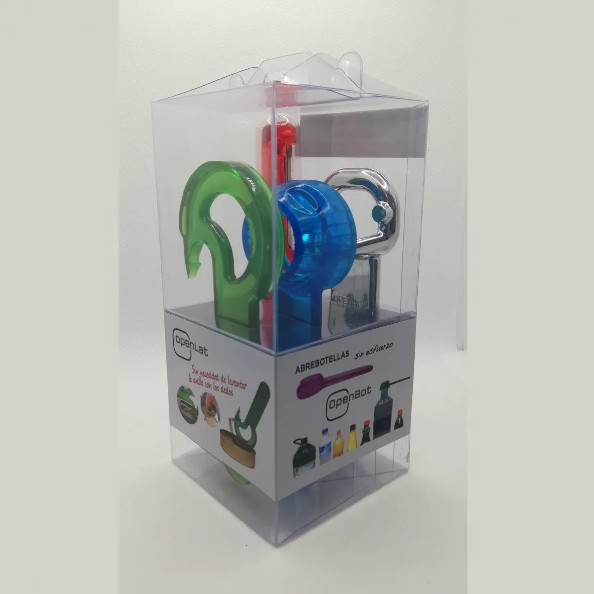 El Set incluye tres coloridos y prácticos abridores (de botes de cristal, de botellas de rosca y de latas de anilla) y un pelador universal con cápsula protectora.