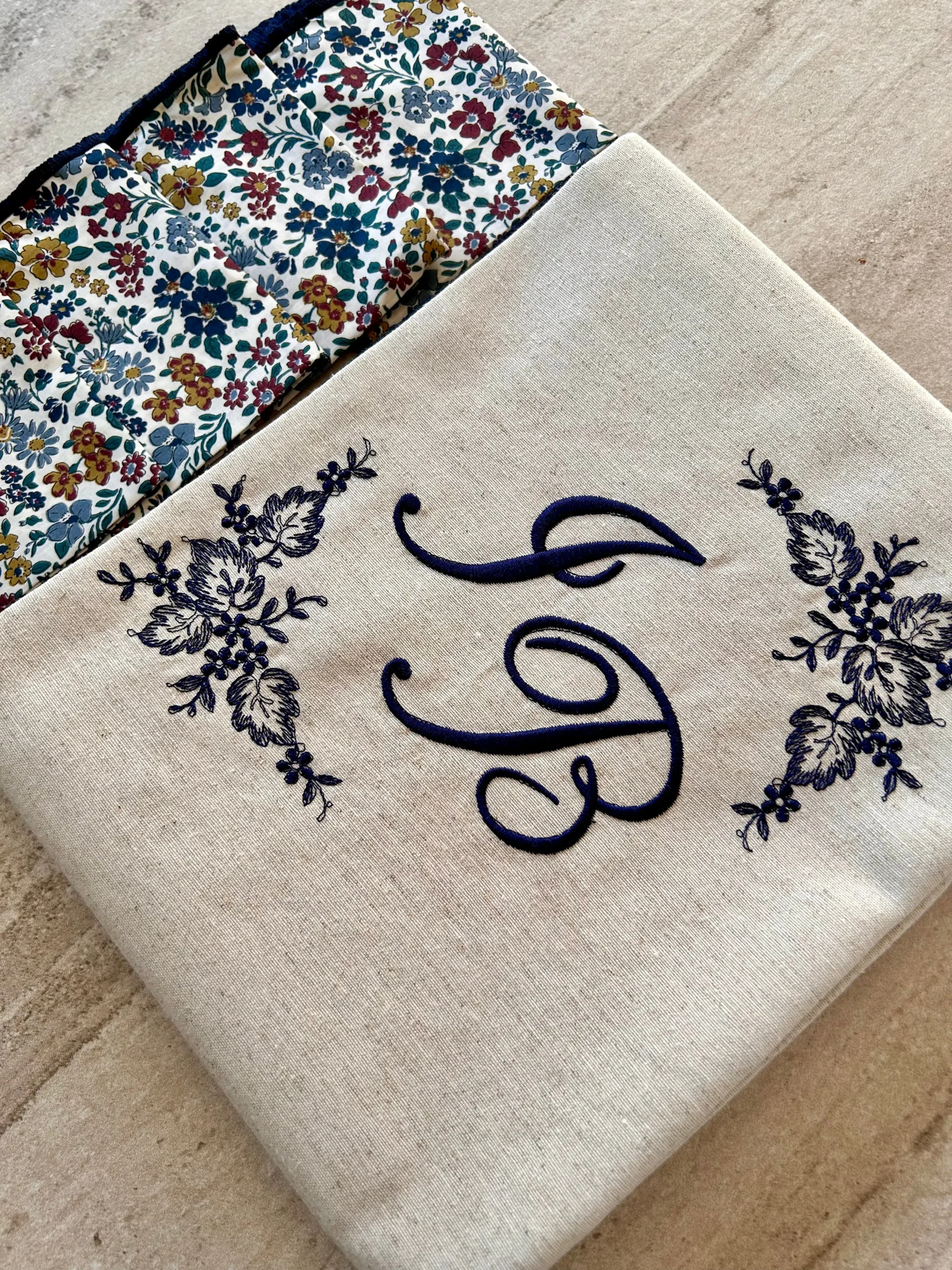 Nuestro conjunto de mantel y servilletas DEHESA es elegante, alegre y delicado. El bordado enmarca las iniciales con unas flores. Su mantel de tono piedra personalizado junto con las servilletas en estampado Liberty, vestirán cualquier ocasión, de manera especial.
