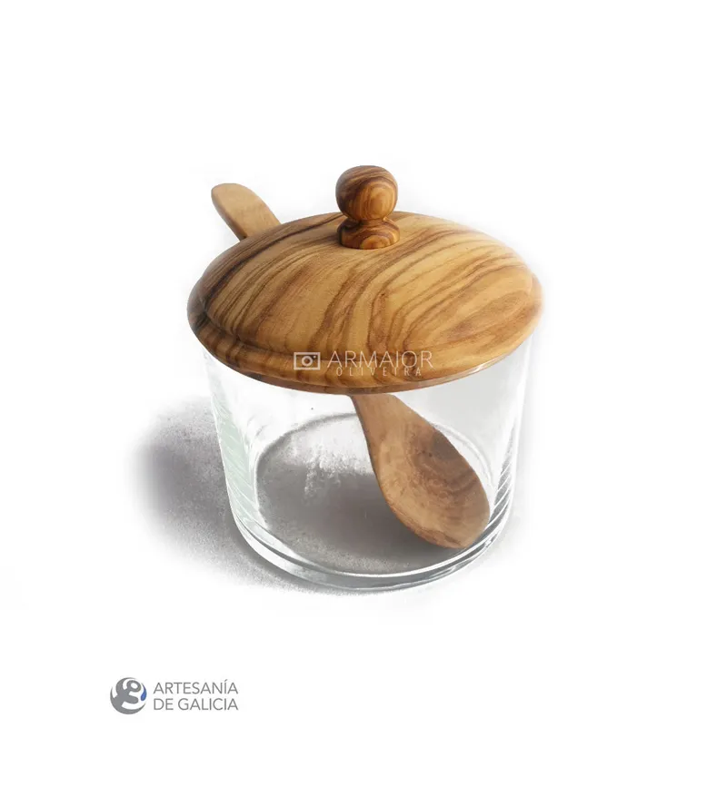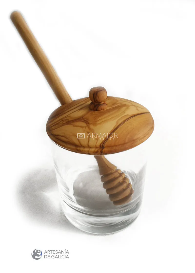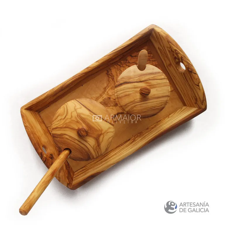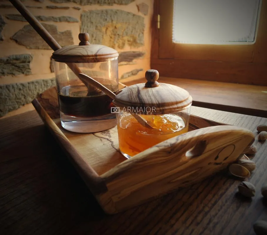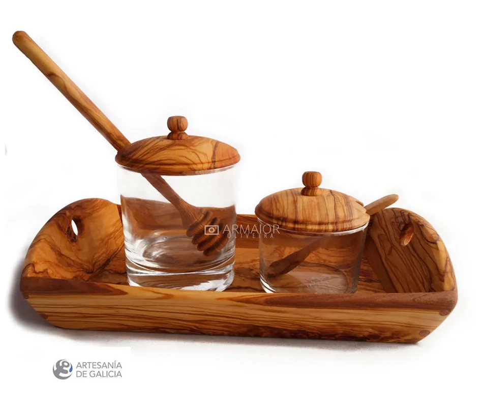 Pack Desayuno: bandeja + mielera+ mermeladera hechos a mano en cristal y madera de olivo. Para hacer de los desayunos un momento mágico. Puedes tener la miel y la mermelada recogidos en la alacena o en tu vitrina donde lucirán tan bonitos y a la vez listos para ser llevados a la mesa de forma rápida y así disfrutar de un desayuno lleno de energía. Puedes usar las piezas de pack juntas o por separado según tus necesidades. Con todas las características que hacen de la madera de olivo una de las más recomendadas para usar en la cocina: