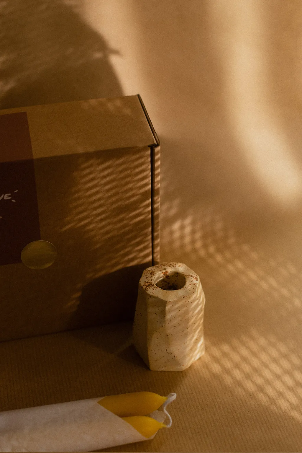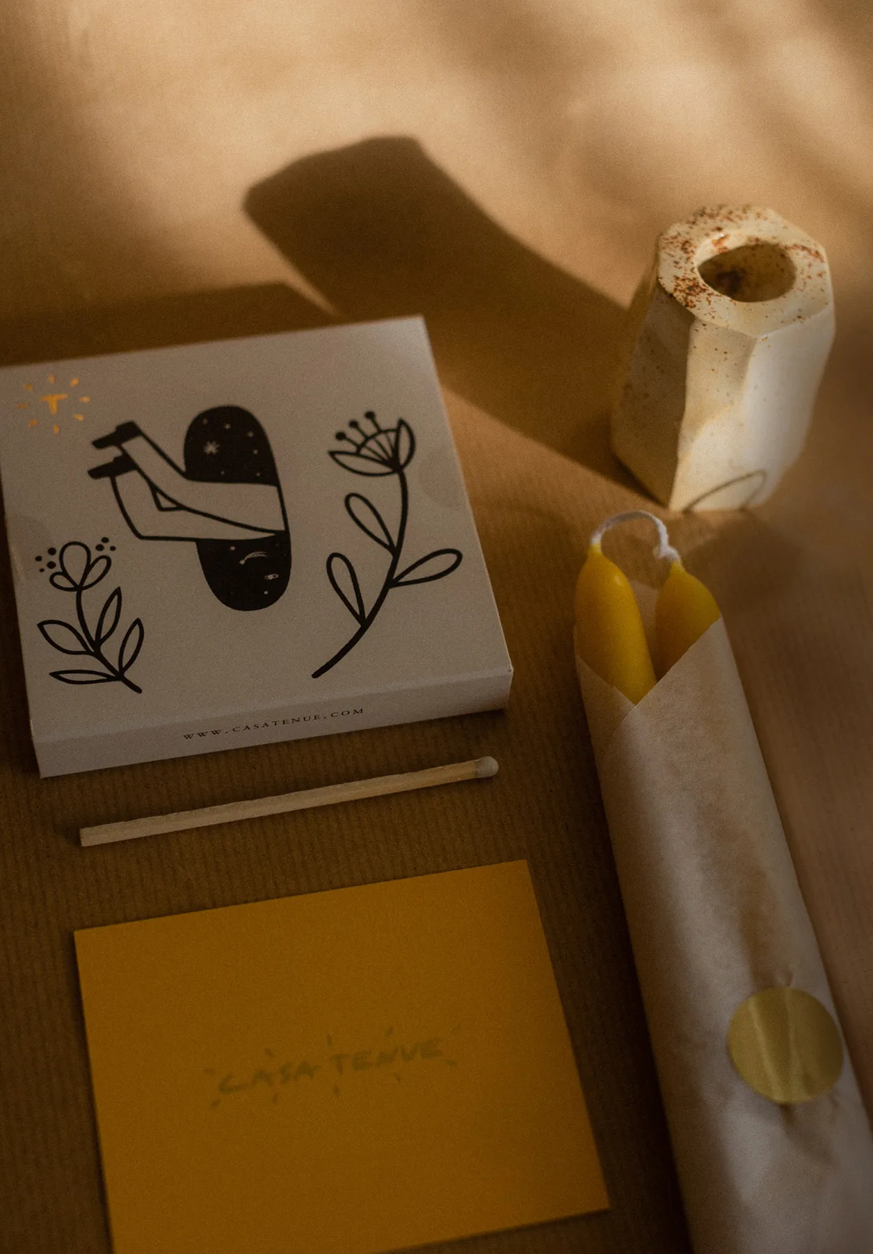 El pack Estela es el pack perfecto para comenzar, con todas las piezas necesarias para darte o regalar un momento especial. Con dos velas Estela de cera de abeja, con el candelabro Atlántida de cerámica y una caja de cerillas.