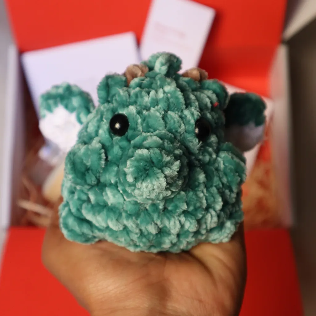 Peluche dragón de crochet, hecho a mano por la artista local Neko Crea. Suave, único y con mucho encanto, ideal para celebrar la leyenda de Sant Jordi con un toque tierno y original.