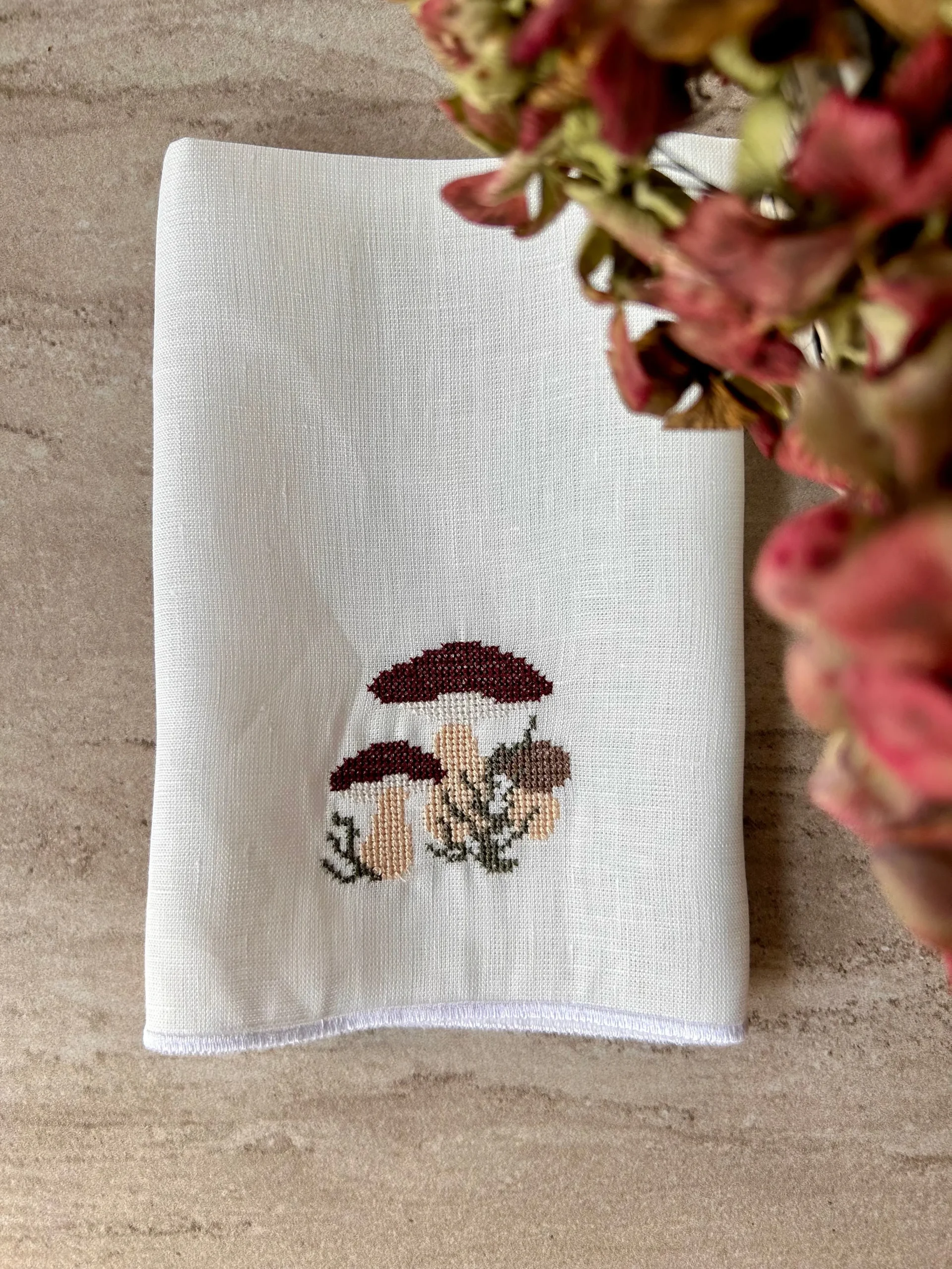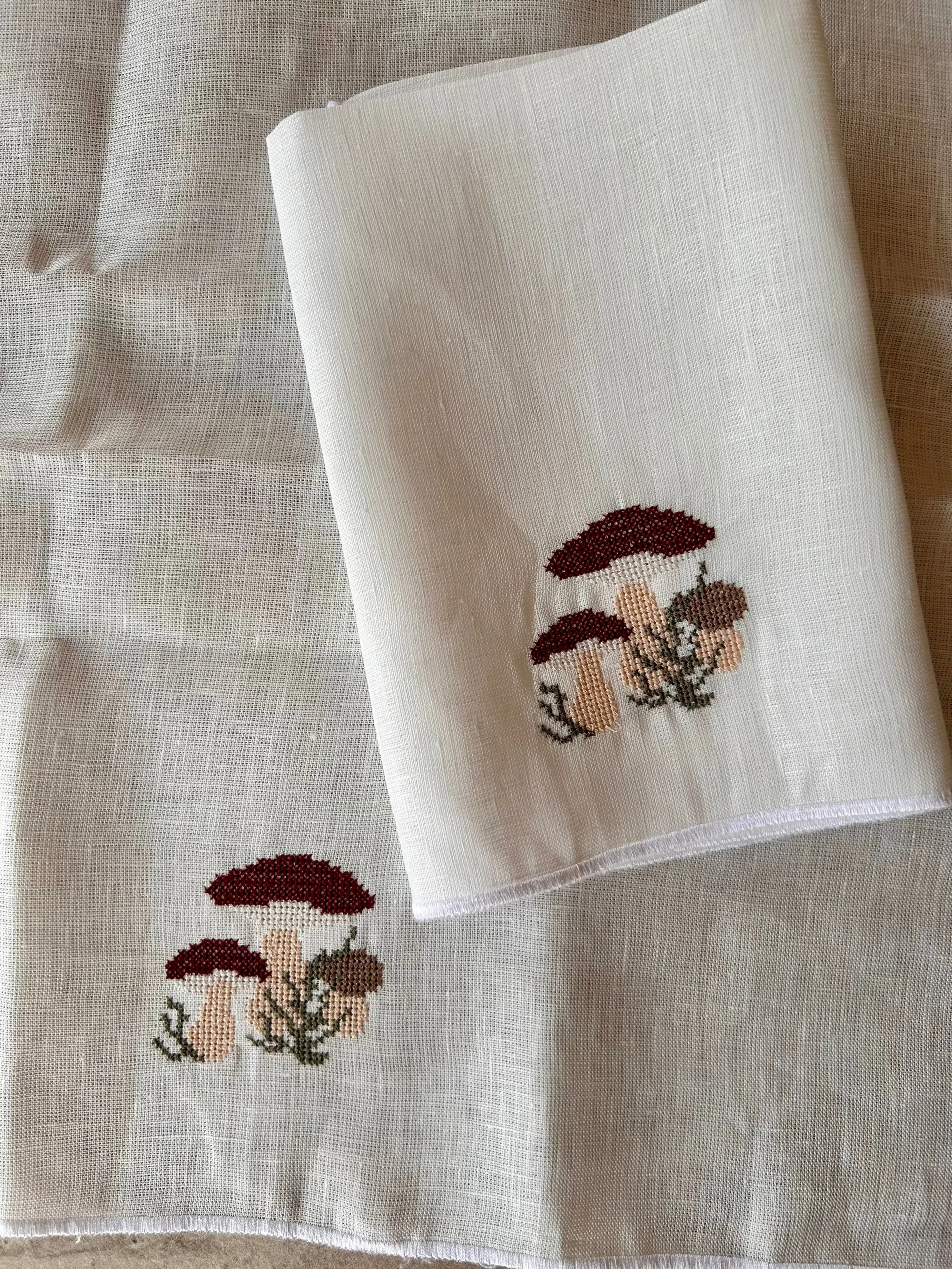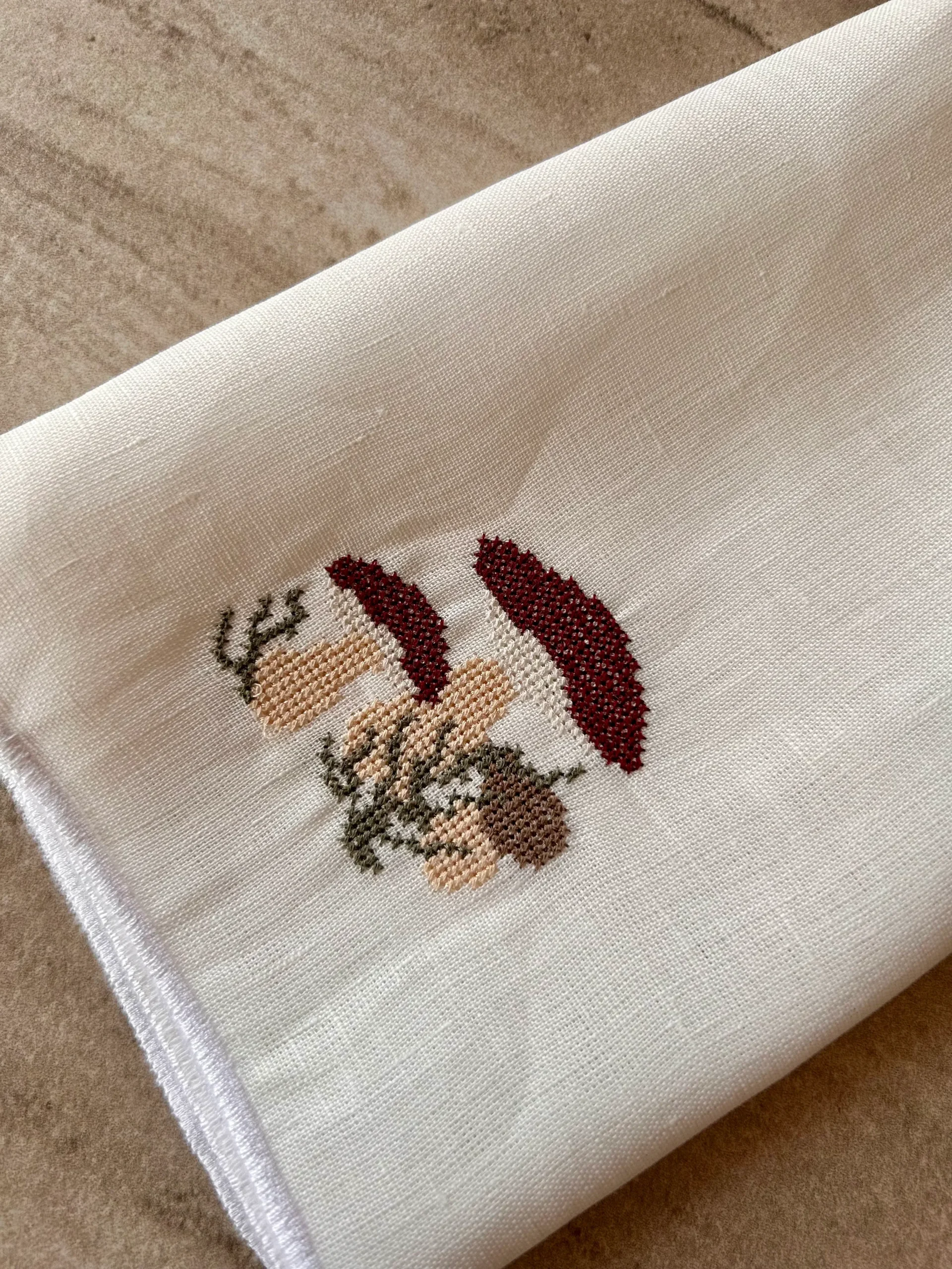 Servilletas de lino con bordado en punto de cruz. Setas bordadas en distintos colores. Tamaño 45x45cm