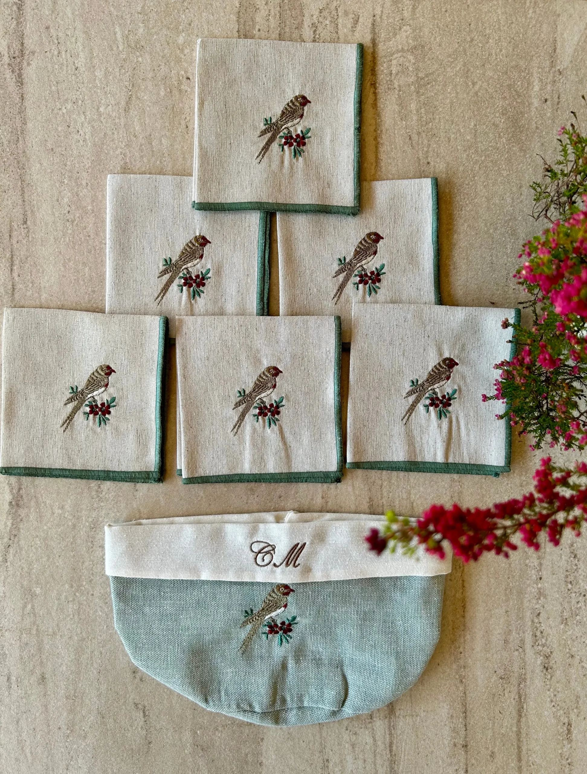 Pack compuesto de cesta panera y 6 servilletas tamaño cóctel. Todo bordado con nuestro pajarito original de CUCA. Combínalo con individuales Salitre Verde o Mantel Salitre Verde.