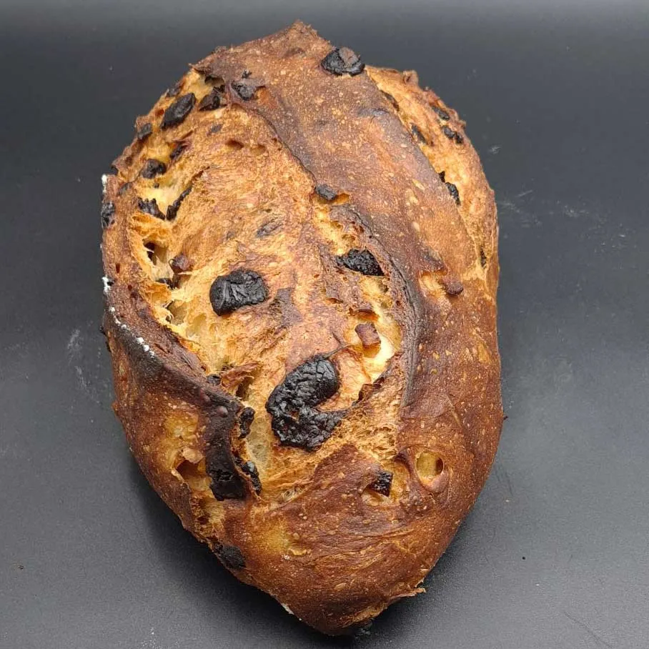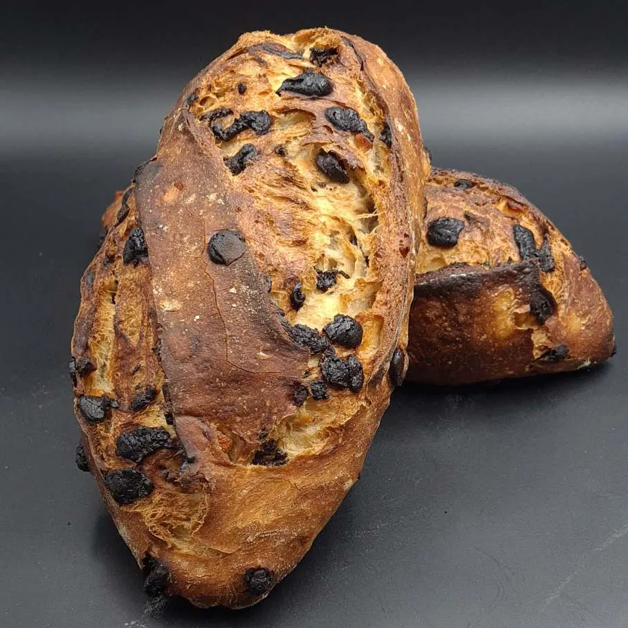 Harina de trigo, agua, sal, masa madre, chocolate puro y naranja. LARGA FERMENTACIÓN.