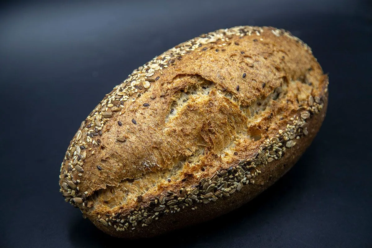 Harina de trigo integral (50%), harina de espelta integral (35%), harina de centeno integral (15%), masa madre, sal, mix de semillas de lino, sésamo, linhaca, pipas de girasol, copos de centeno, agua y levadura (1%).