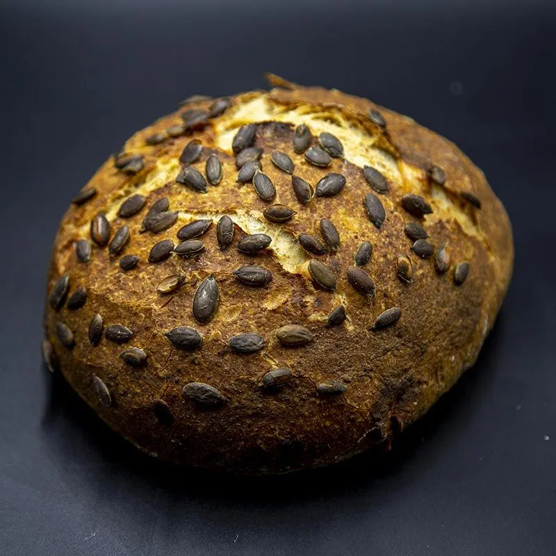 Harina de trigo de primera calidad, masa madre, agua, sal, mostaza, queso edam semicurado, pipas de calabaza, y 0.6% de levadura.