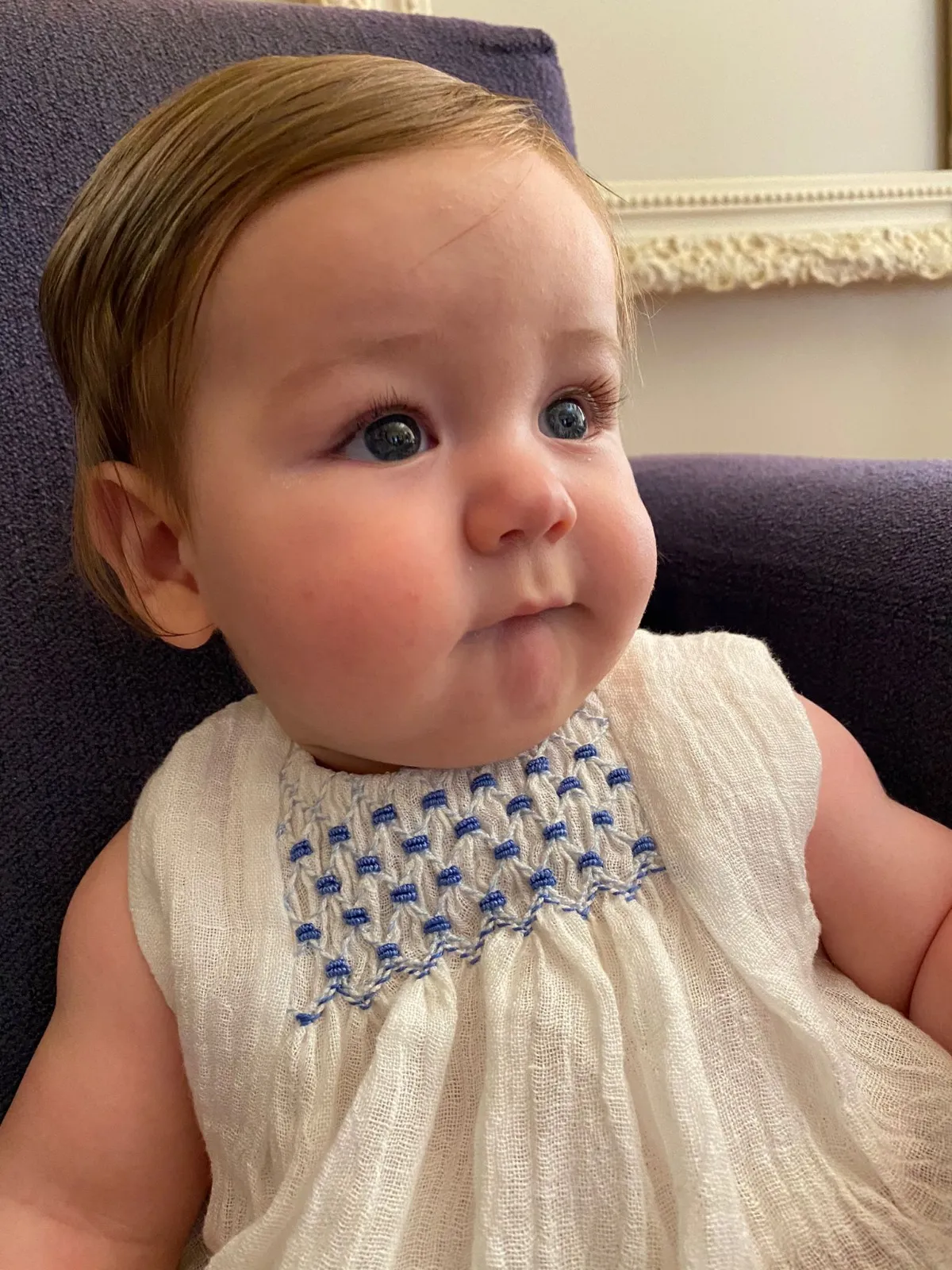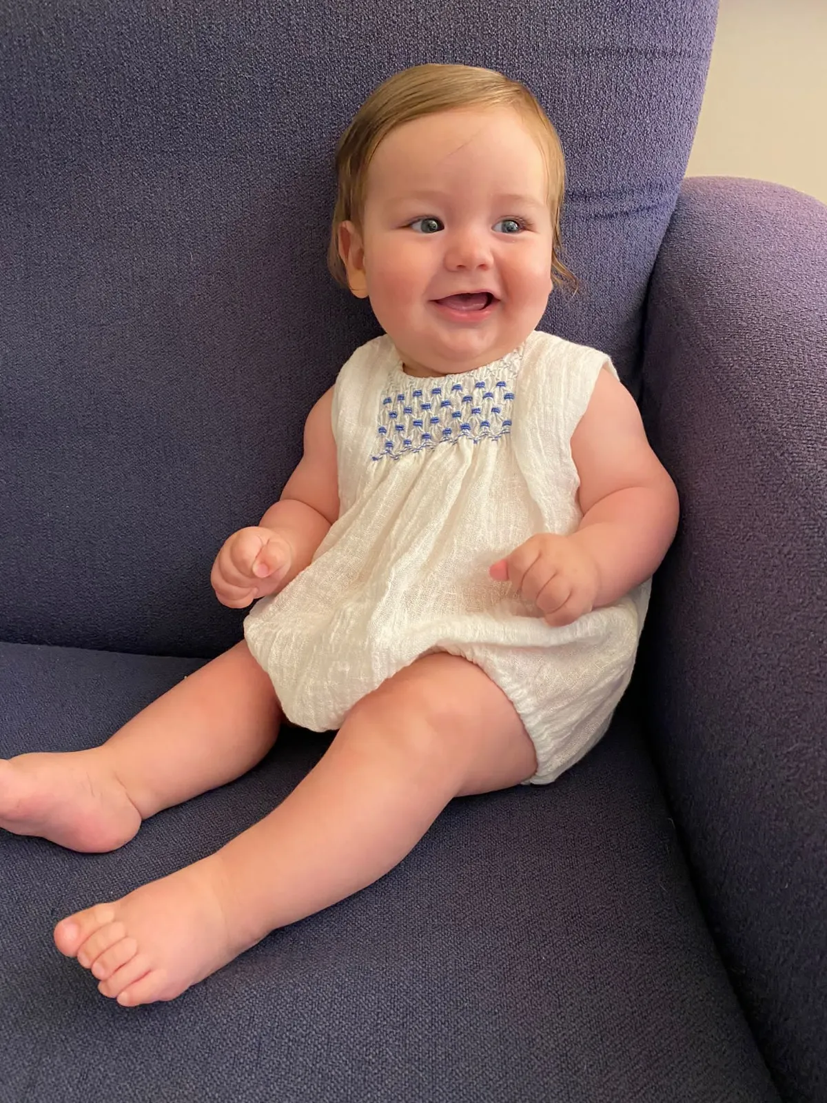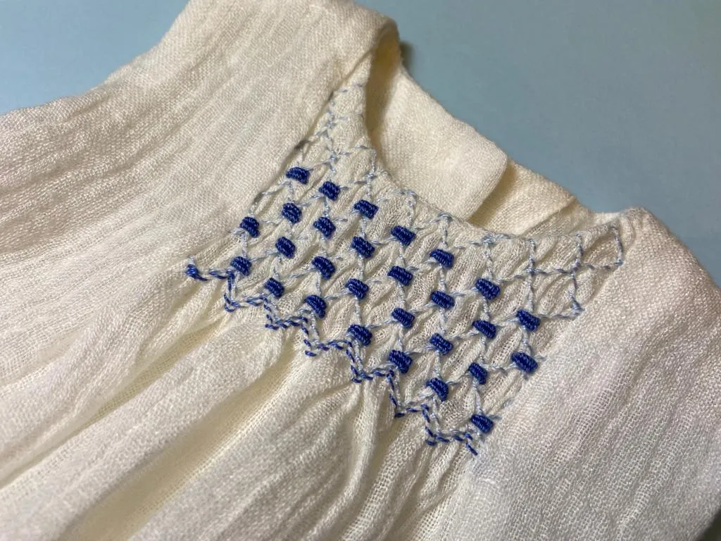Pelele de gasa de lino blanca, con bordado de nido de abeja de colores azulados.