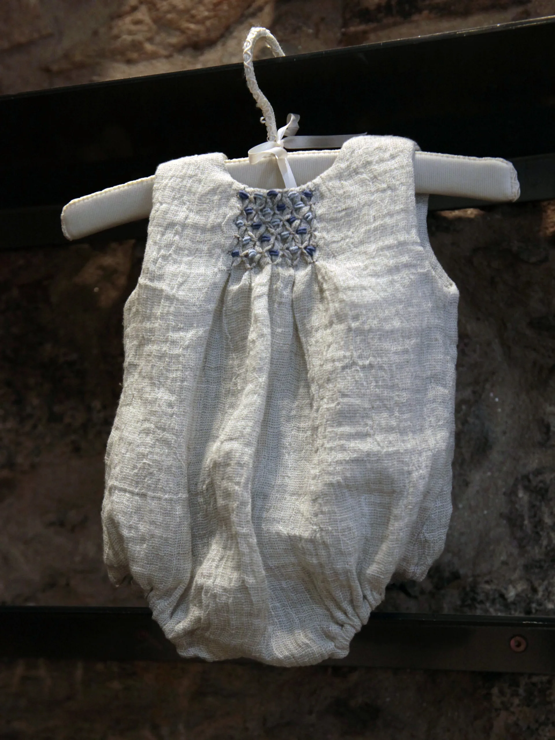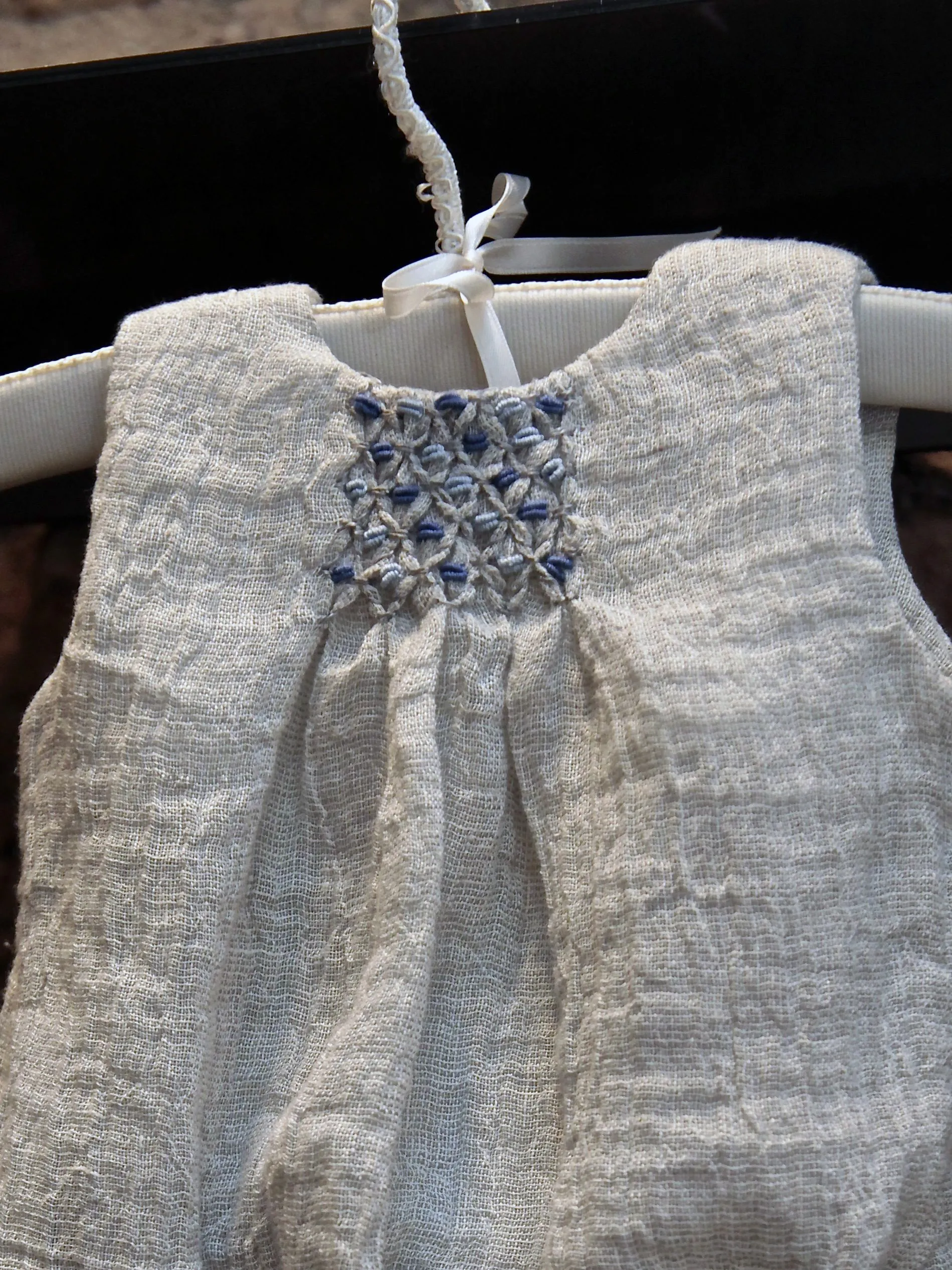 Con una gasa de lino arrugado color gris azulado hemos elaborado este delicado pelele en el que destaca el punto smock bordado a mano en tonos azules .