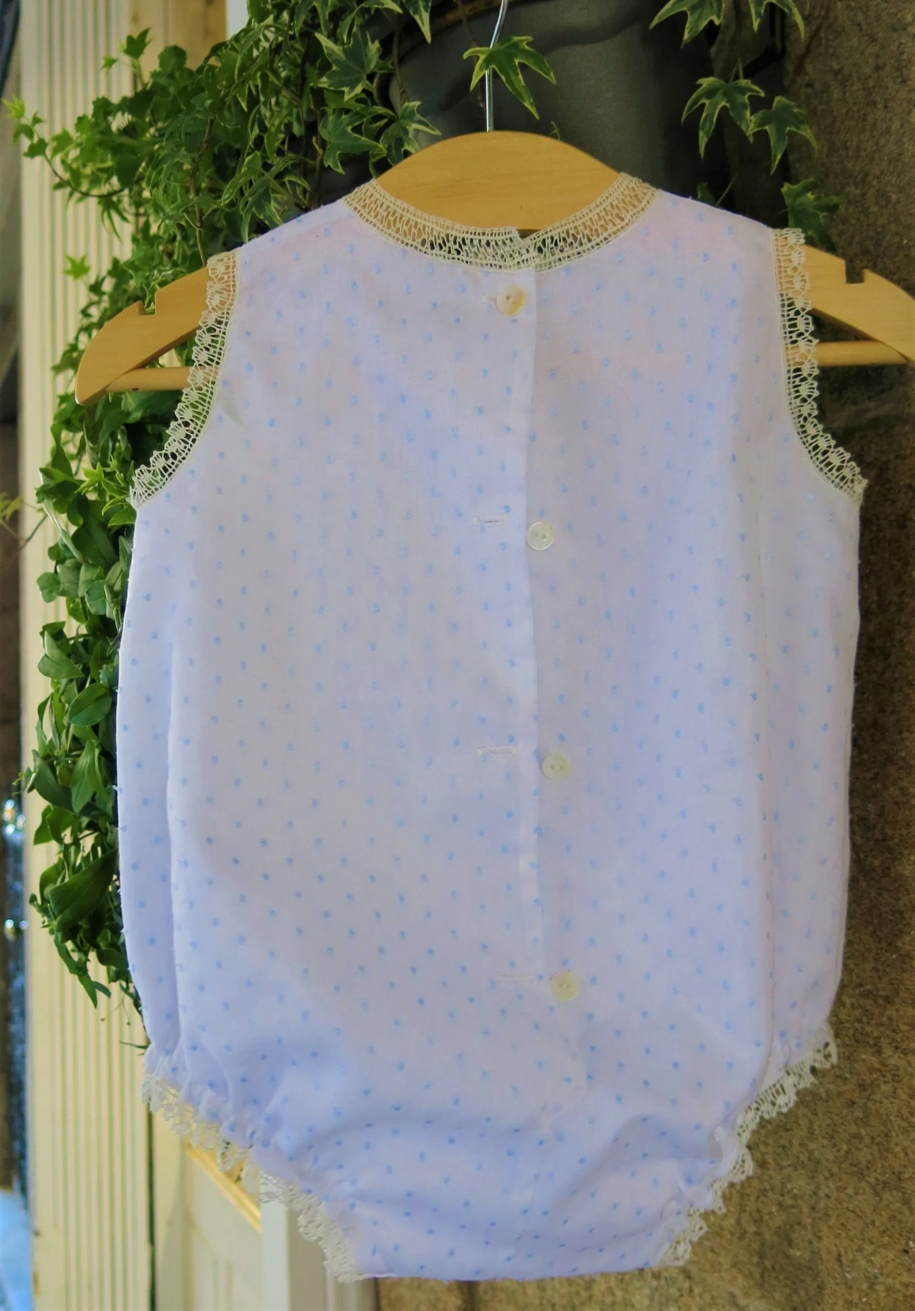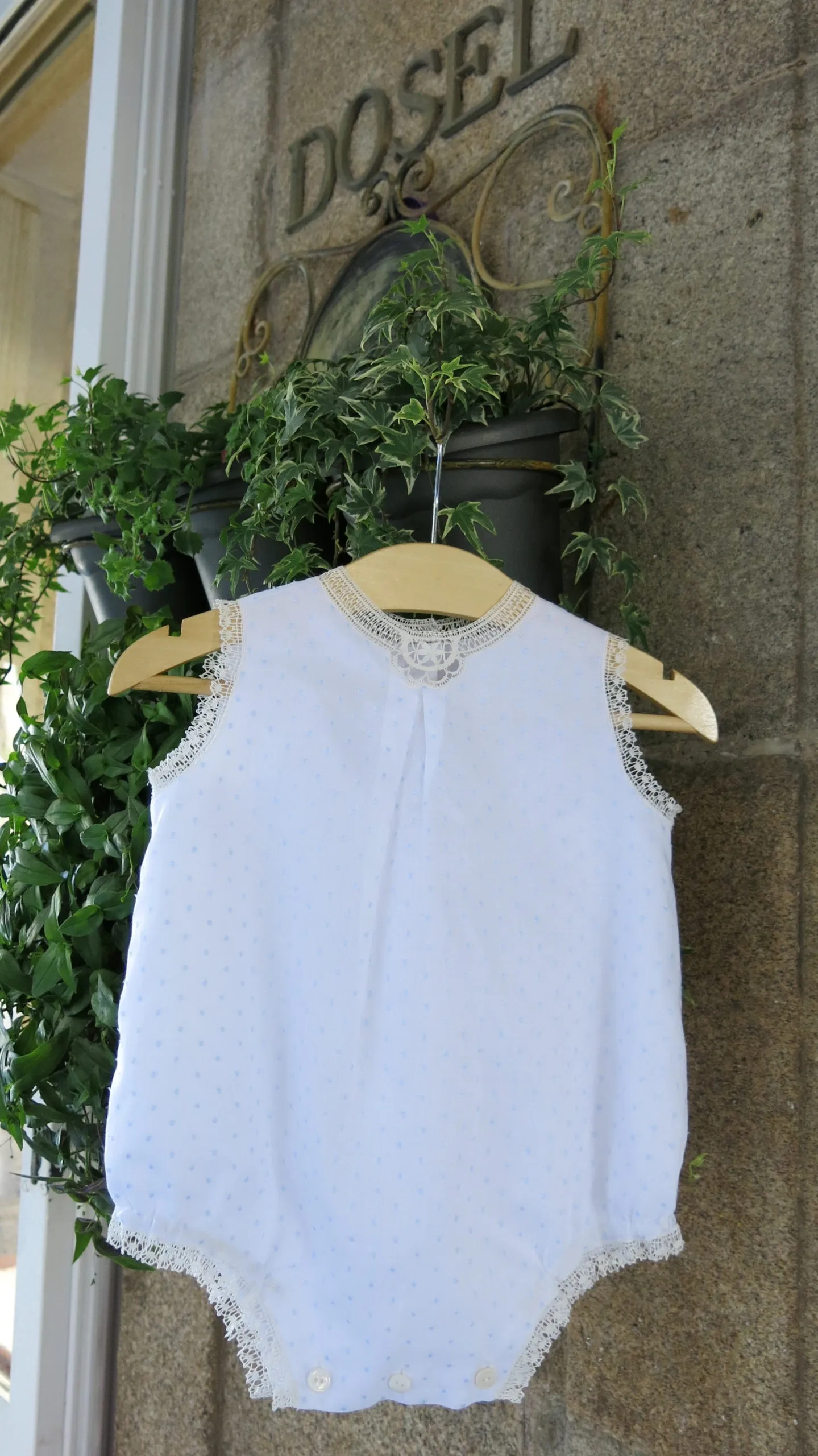 Esta delicada pieza ha sido elaborada de modo artesanal. Para ello hemos seleccionado nuestros mejores materiales, el plumeti suizo forrado con una finísima batista va rematado con un delicado encaje de bolillos hecho a mano. El encaje de bolillos, nuestra especialidad, nos permite rematar la pieza sin costuras, logrando que sea una segunda piel para el bebé.