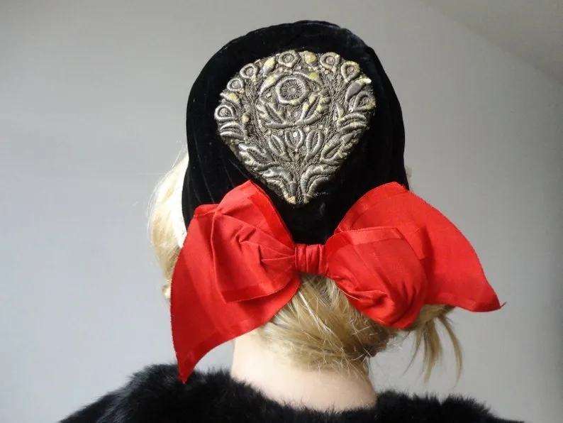 Procedente de Dinamarca, tiene la silueta inconfundible de las cofias nórdicas, pero adaptado al gusto del siglo XIX. Se compone de un cabecero bordado en hilo metálico en relieve, ala de terciopelo de seda negra y un fabuloso lazo rojo colocado sobre la nuca. En la parte delantera todo el contorno va rematado con una delicada puntillita blanca ¡Delicioso!