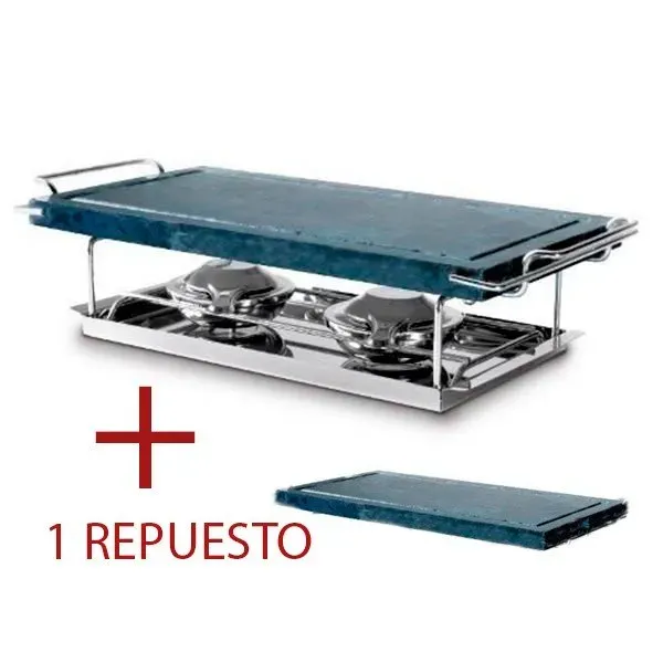 Piedra asar carne a la piedra 37x19x2 con soporte y 2 quemadores + Piedra de recambio adicional. Esta piedra es de mármol, y se puede rajar con facilidad, de modo que si quiere una piedra de alta calidad y resistencia deberá elegir un modelo de piedra volcánica. La piedra volcánica es la piedra de mayor calidad que existe para cocinar e la piedra.