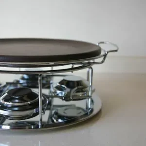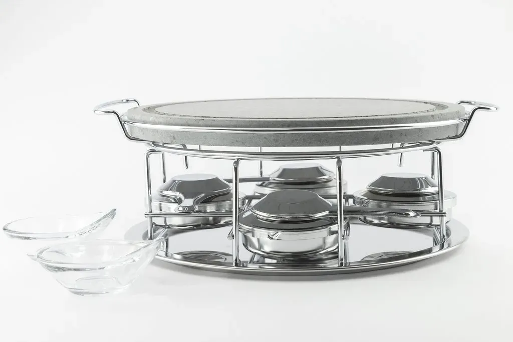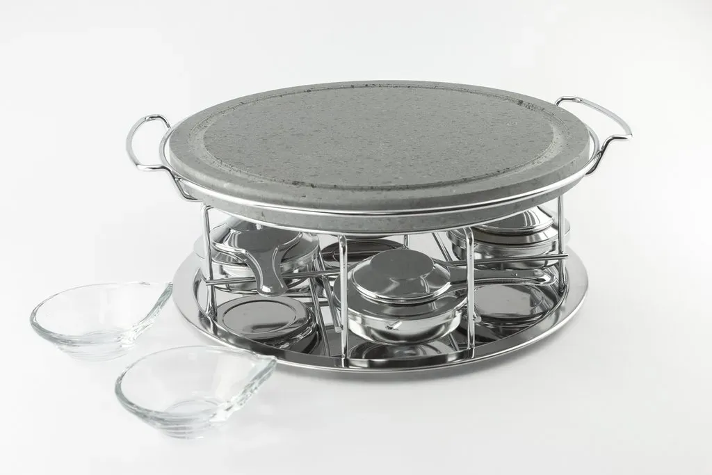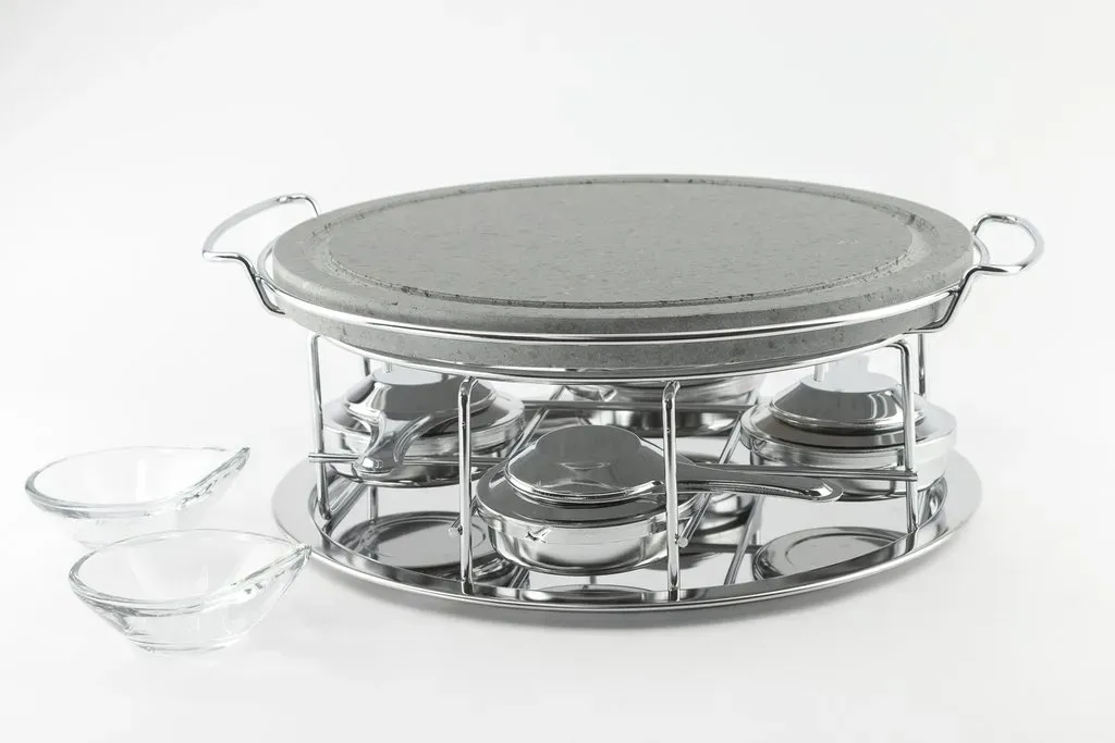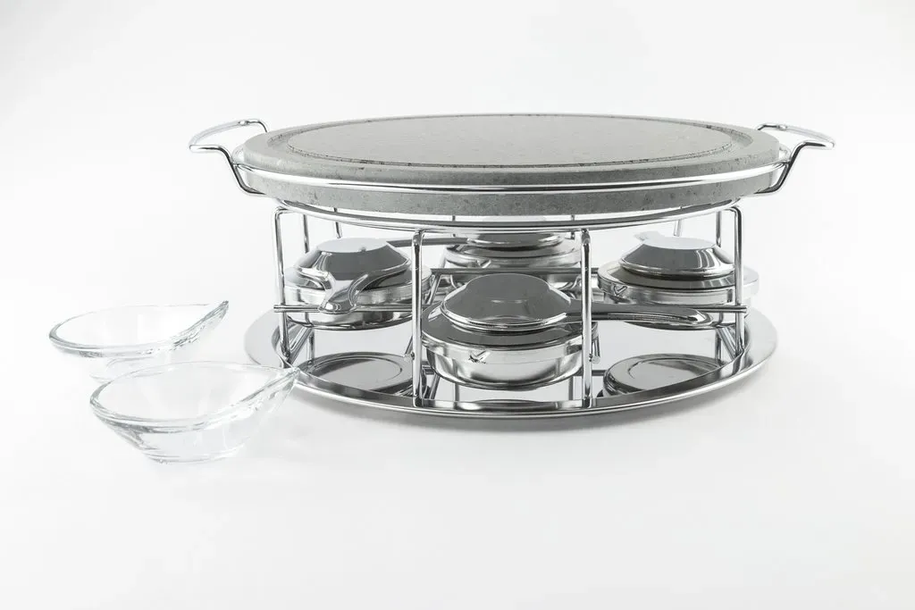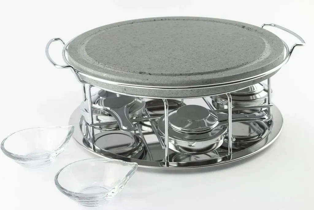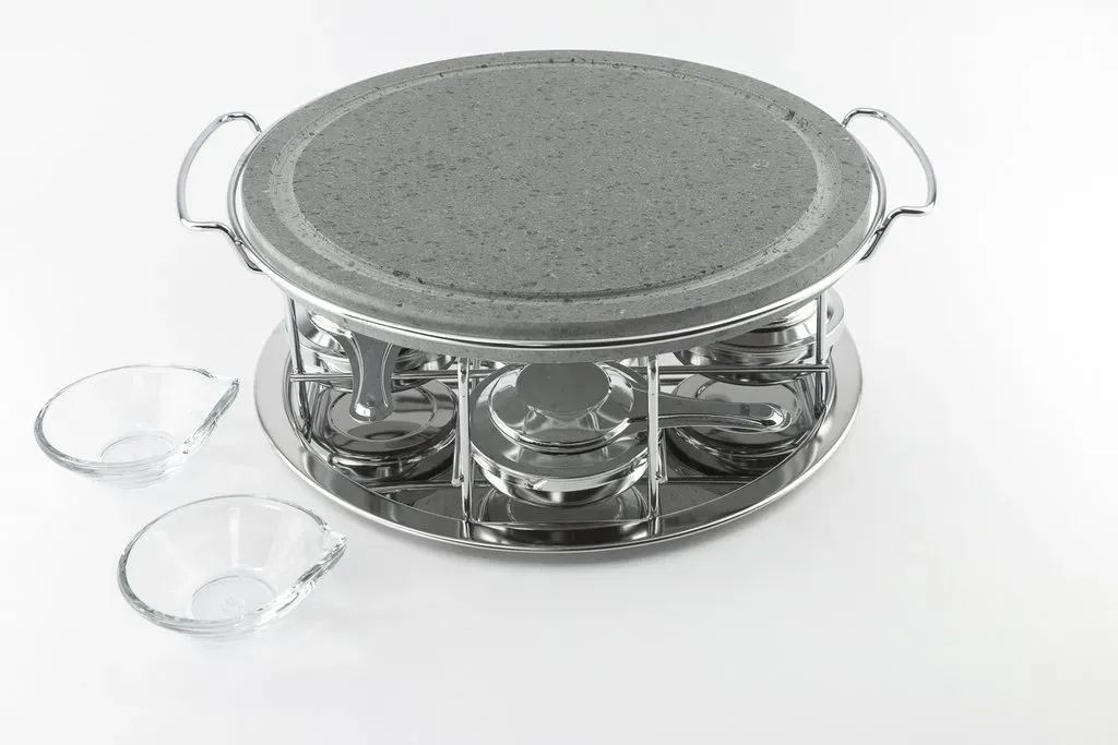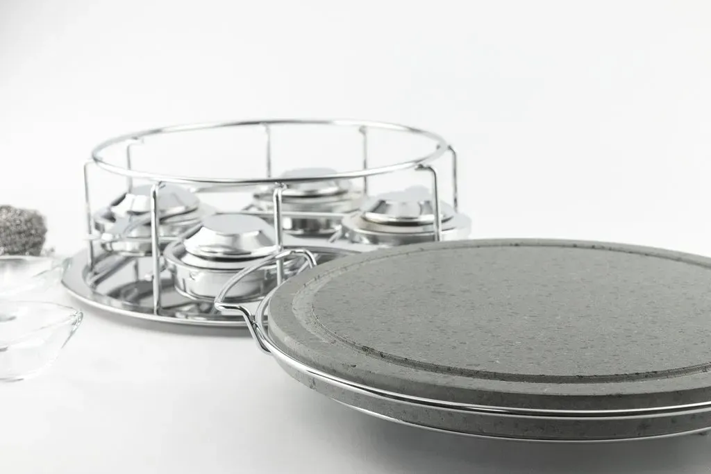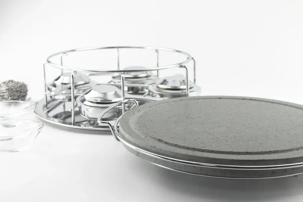 Piedra asar volcanica redonda 30cm, soporte y 4 quemadores cerrados de alcohol y 2 salseros