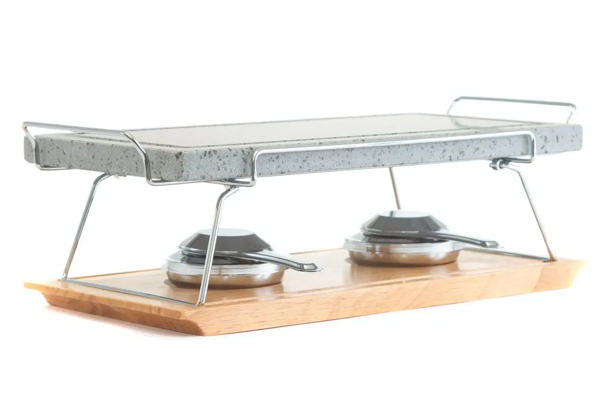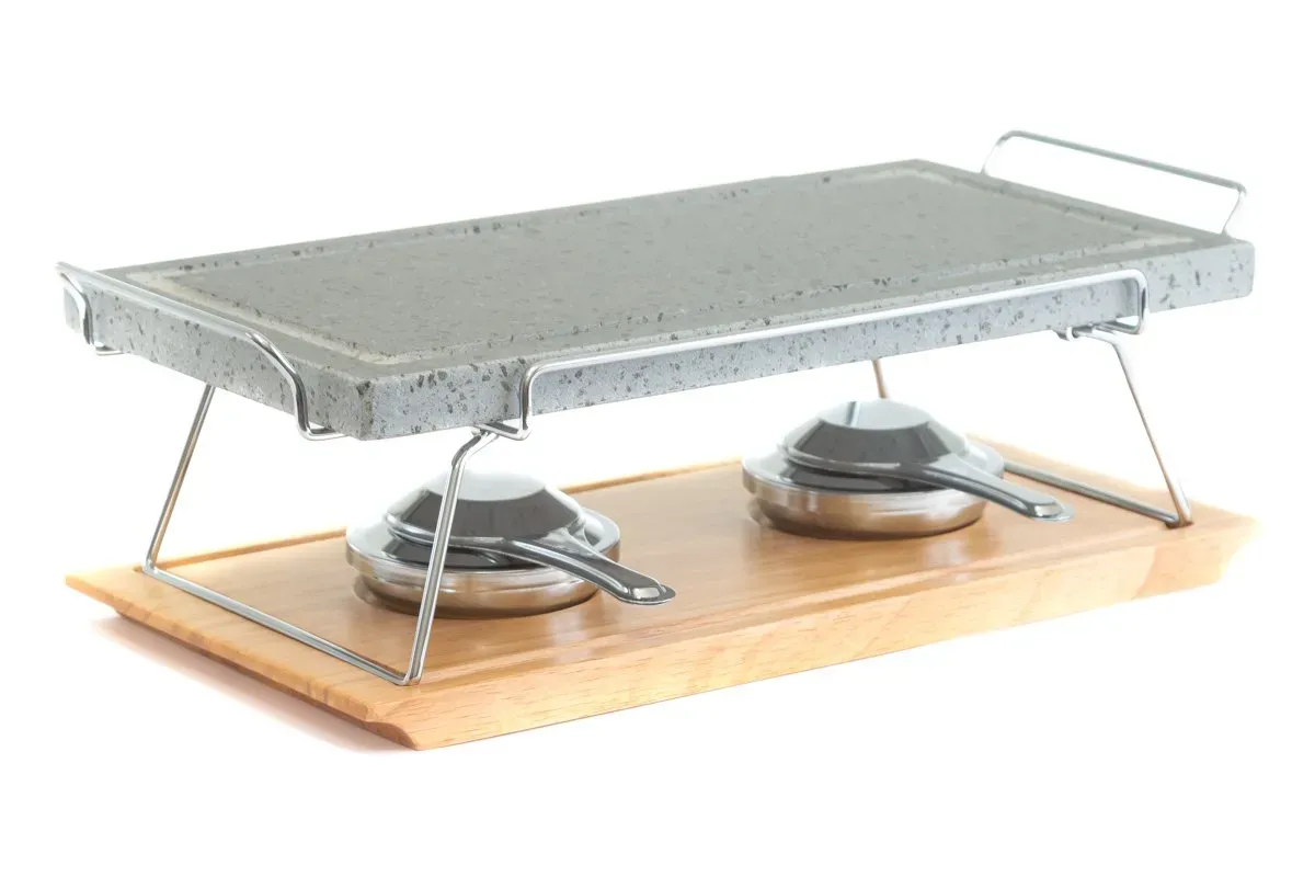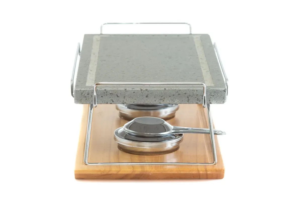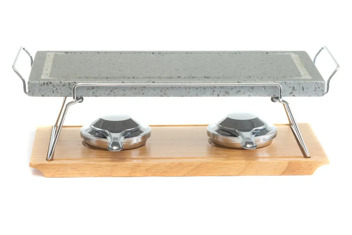 Piedra para asar Volcanica de 37x19x2,5cm con base de madera, soporte y quemadores