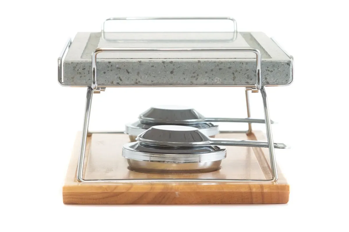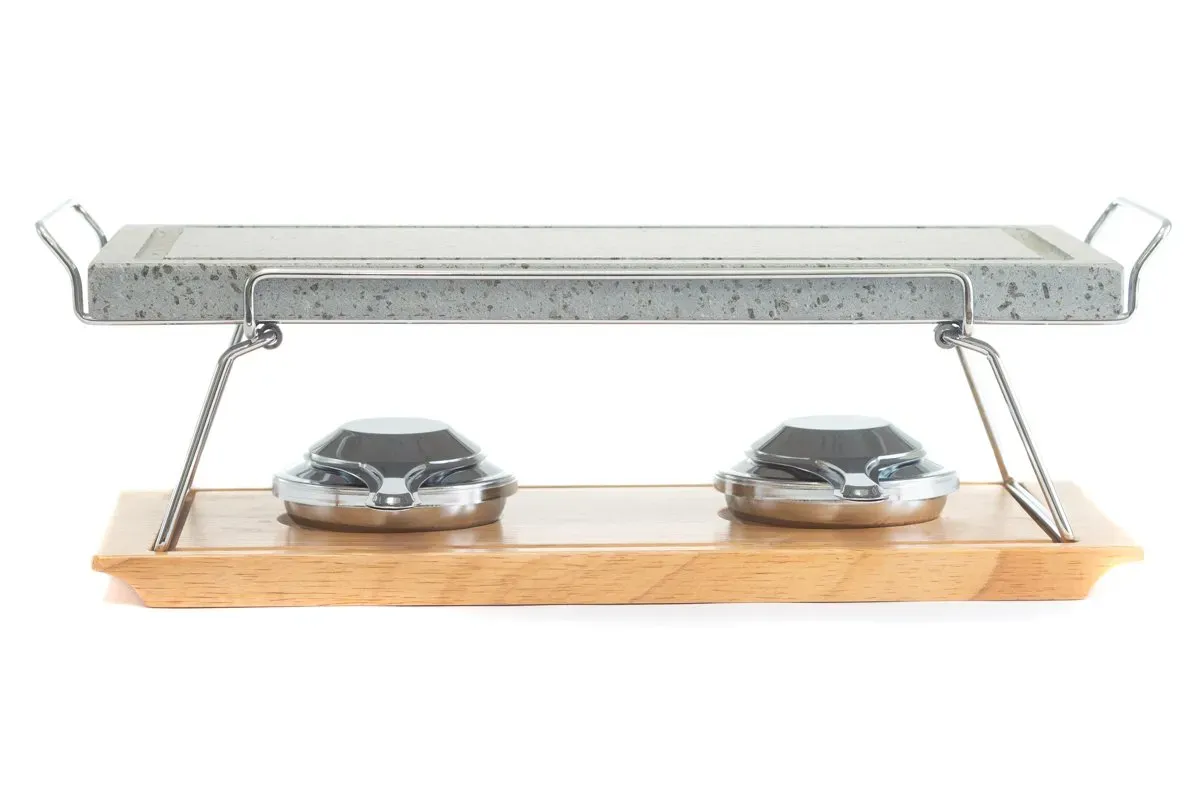 Piedra para asar Volcanica de 37×19 con base de madera, soporte y quemadores