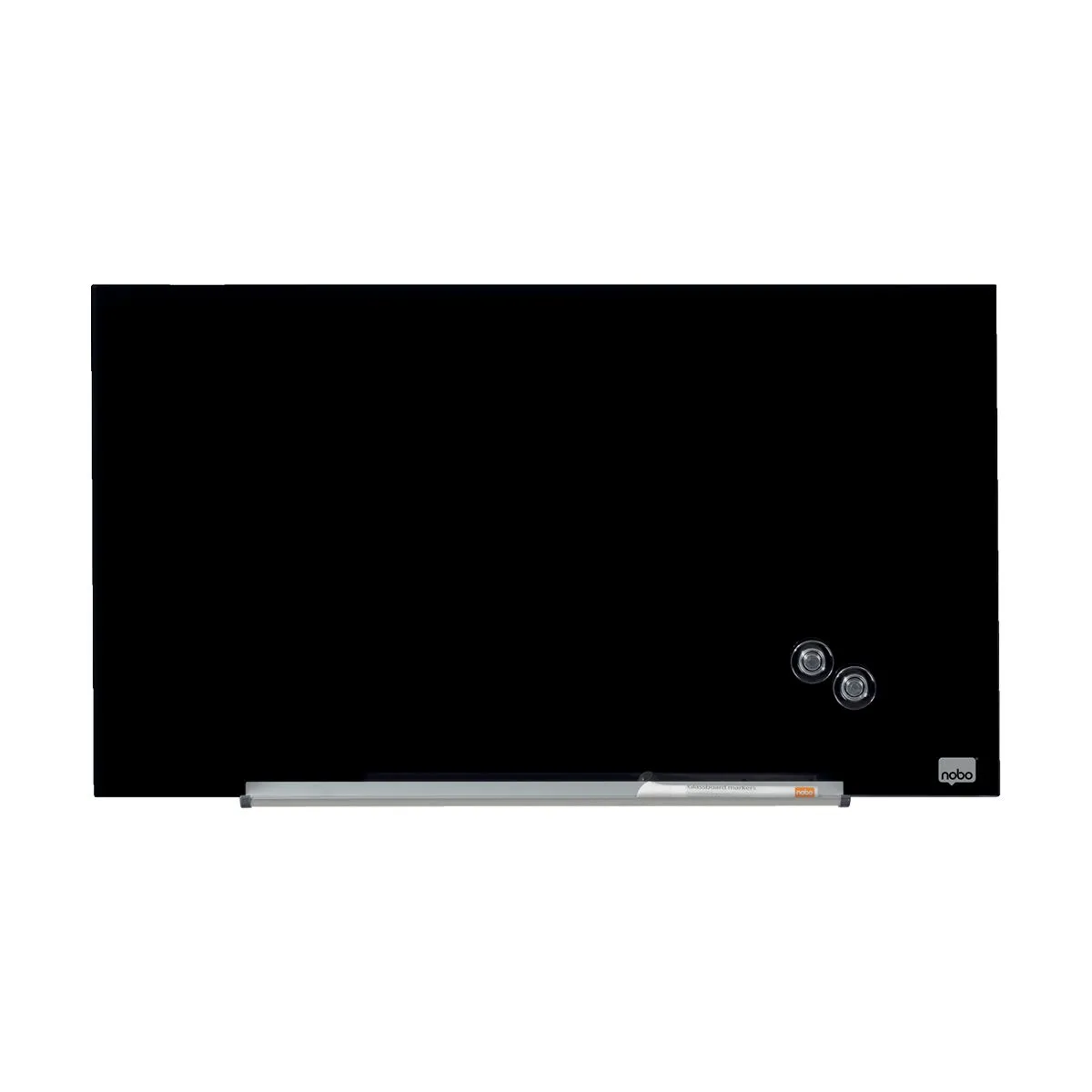 Tablero magnético de cristal templado negro para escritura con rotulador y fijación a pared. A partir del tamaño 68×38, el formato es panorámico y se entrega con un portamarcador regulable y extraíble.