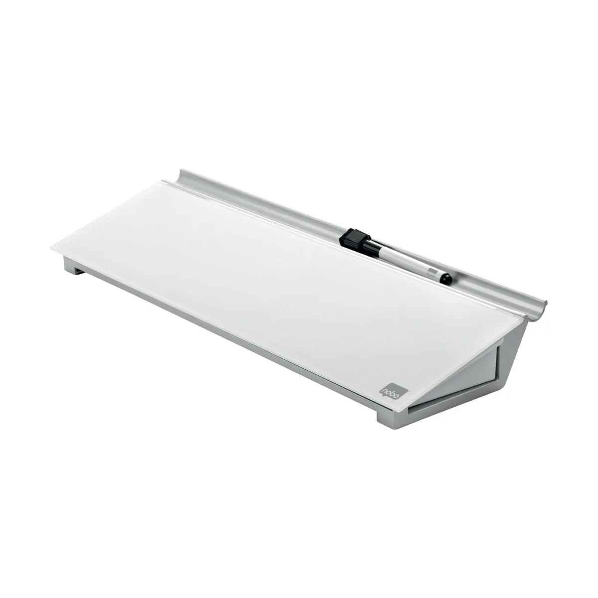 Base/Pad de escritorio de vidrio templado blanco, para escritura directa con rotulador con mini cajón para material de oficina. Incluye mini rotulador con goma de borrar en la tapa. Ideal para colocar detrás del teclado y tomar notas.