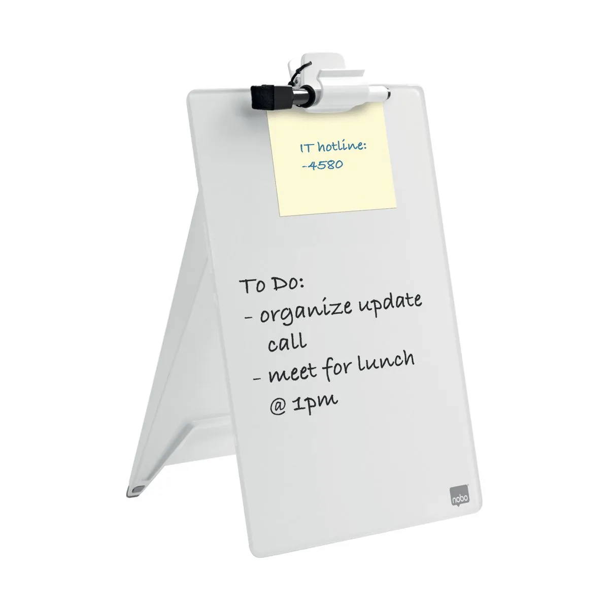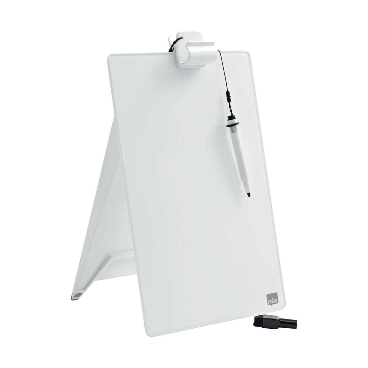 Portapapeles de cristal templado blanco, para escritura directa con rotulador o utilizando papel hasta tamaño A4. Se puede utilizar en sobremesa o como portapapeles en la mano. Incluye clip para hojas y mini rotulador con goma de borrar en la tapa.