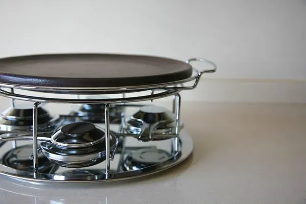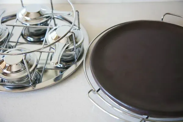 - Incluye: 1 plato de cerámica refractaria, 1 bandeja, 1 soporte, 1 asa 4 quemadores de alcohol