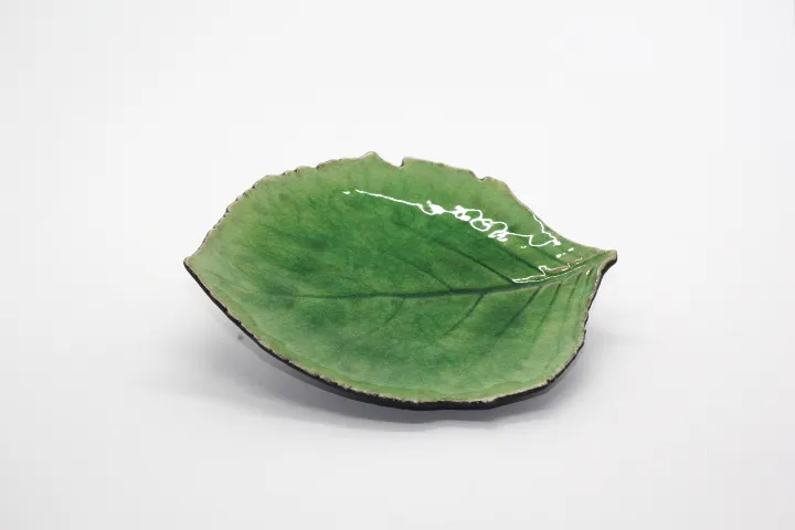 Fuente de 22cm con esmalte- gres verde en forma de hoja. 21.8 x 19.1 H3.3 cm