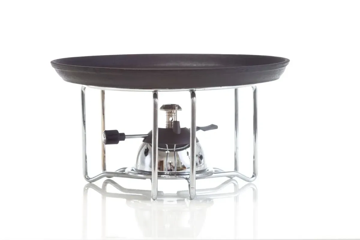 Plato Hierro fundido de 26cm para carne con soporte y quemador gas recargable. PROMOCIÓN REGALO: le regalamos 1 bote de gas de recarga con su pedido.