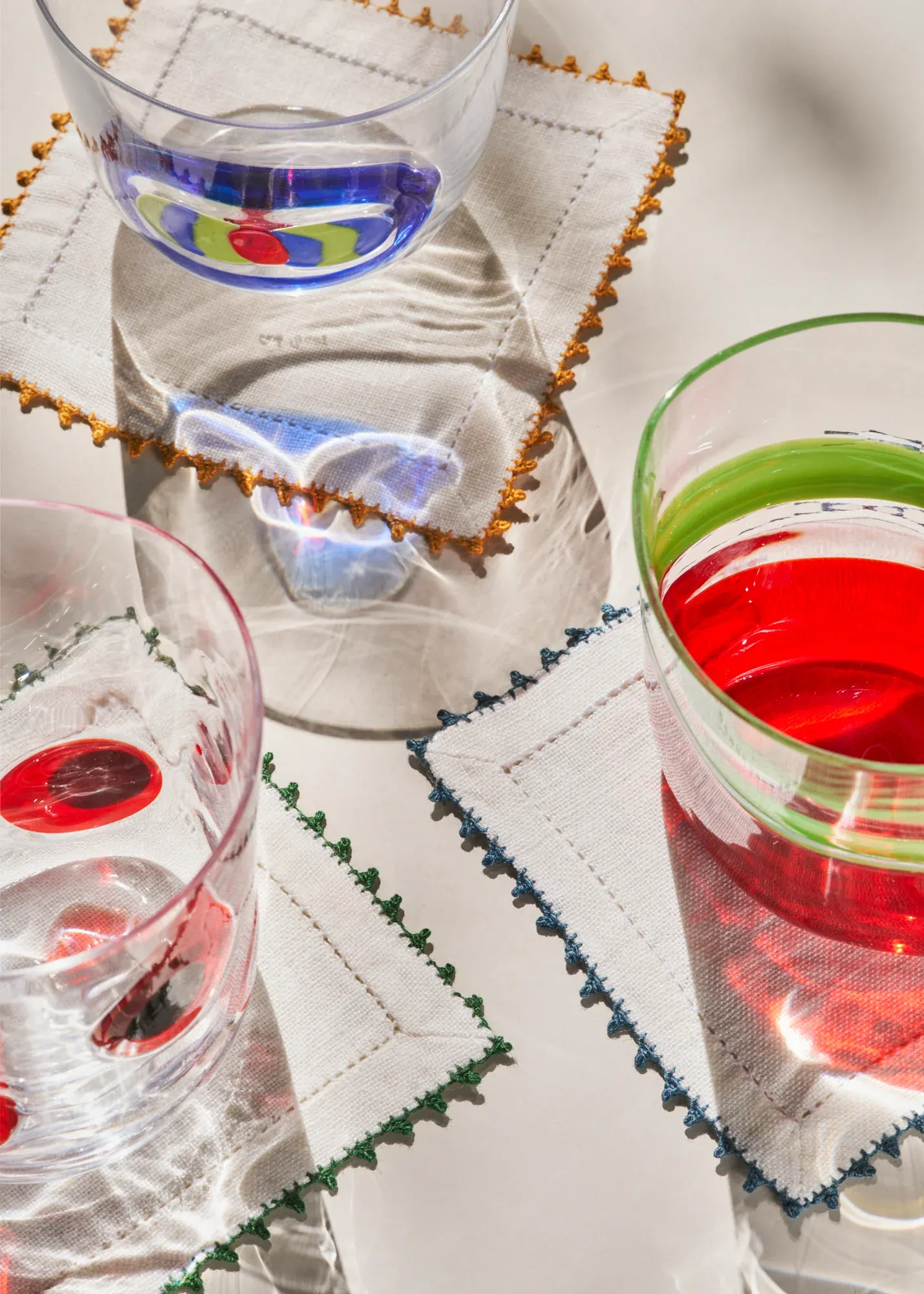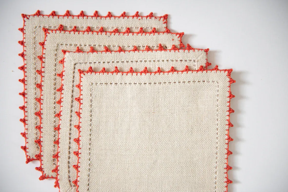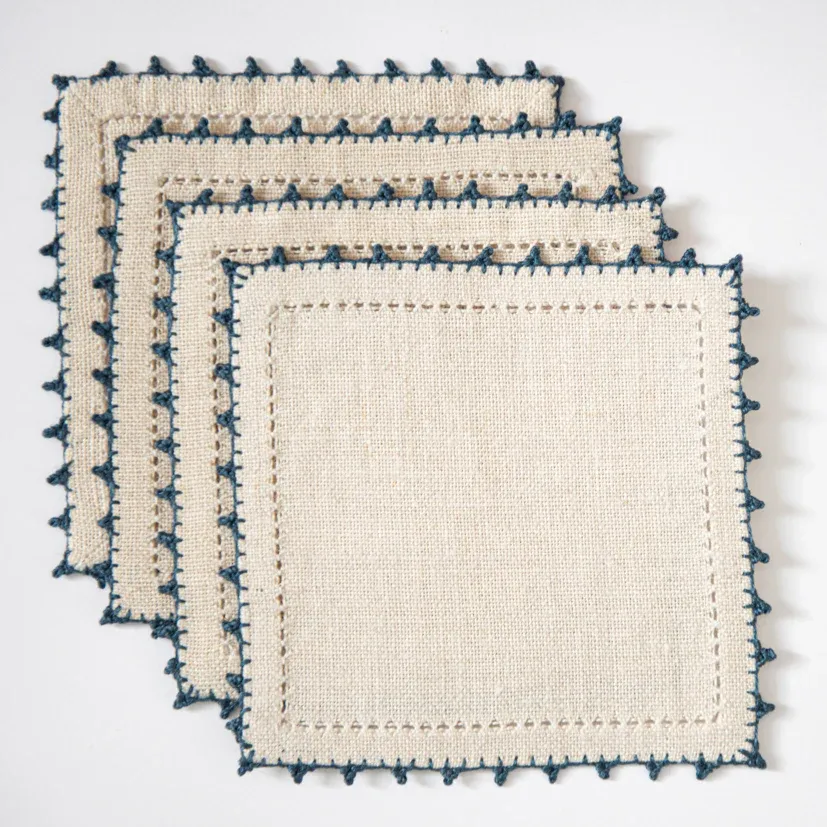 Posavasos de lino primorosamente confeccionados y bordados a mano con perfil de piquillos en multiples colores.