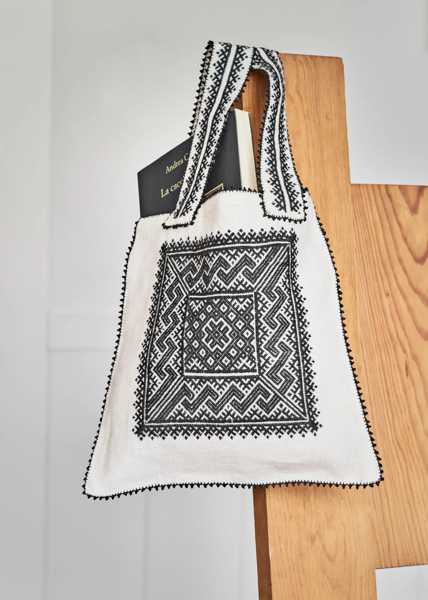 Bolso de lino confeccionado y bordado a mano, con la técnica del tejidíllo y rodeado de piquíllos. El original de esta exquisita bolsa de fibras naturales esta basada en una pieza antigua de familia. Este bolso ha sido tejido por las mujeres de la provincia de Toledo.