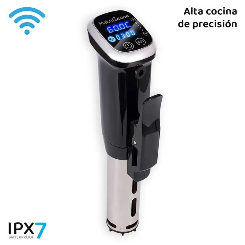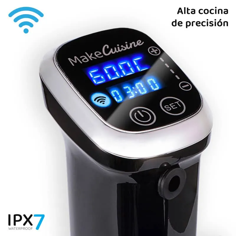 Simplemente ajusta la temperatura y presiona inicio, desde tu móvil mediante la App MakeCusine Smart Cook o desde el gran panel de control de pantalla táctil anti-empañable. Deja los alimentos en el recipiente y continúa tu día hasta que estén listos para comer o conservar. Saborea experiencias gastronómicas únicas con ThermoCooker MC-SV1 WiFi de MakeCuisine.