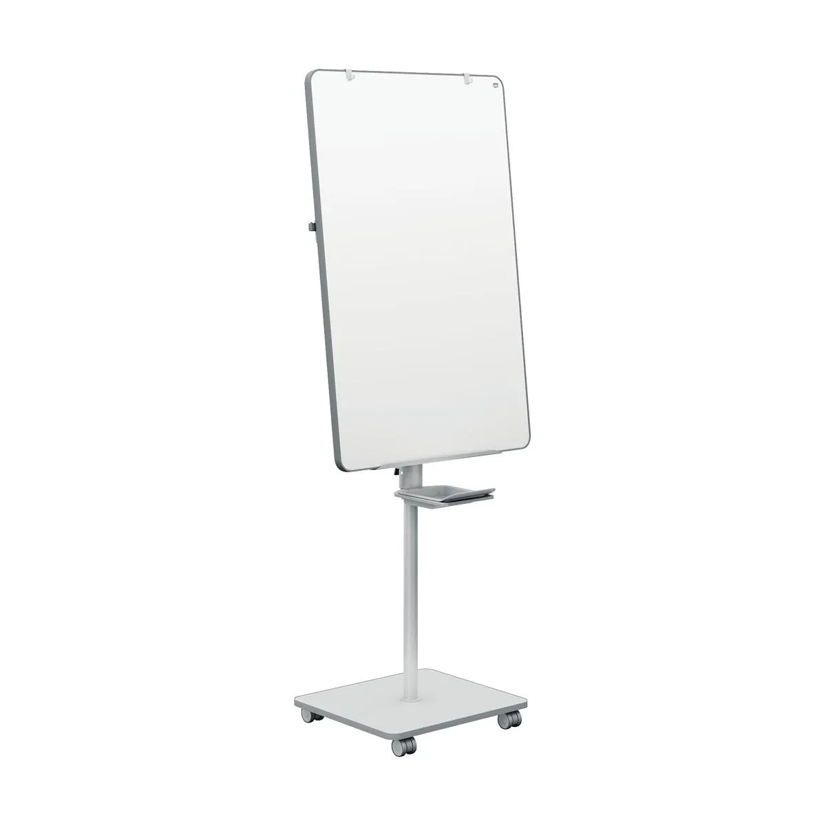 Pizarra de conferencias portátil de acero lacado en blanco, de doble cara, para escribir directamente con un rotulador o utilizando un bloc de papel, con caballete regulable en altura con ruedas, puede utilizarse en vertical o en horizontal.