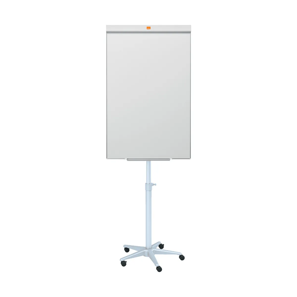 Pizarra portátil de acero lacado en blanco, para escritura directa con rotulador o uso de bloc de papel, con caballete regulable en altura con ruedas.