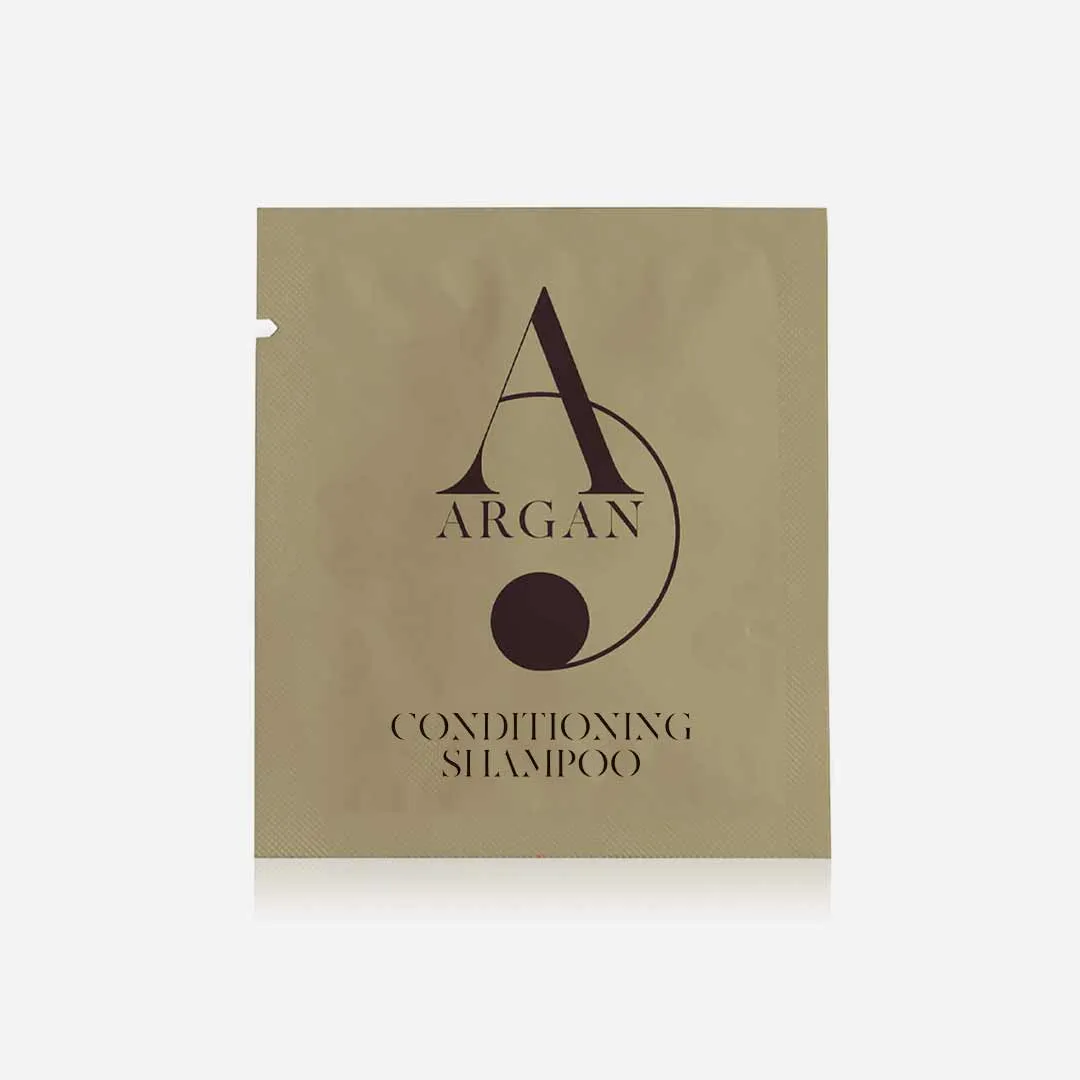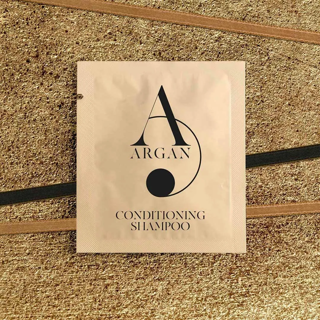 Sachet Argán de 10ml con una línea elegante y refinada. Proporciona a tus clientes un champú acondicionador de la máxima calidad y que perciban todos los beneficios para el cabello que aportan las propiedades naturales procedentes del Argán.