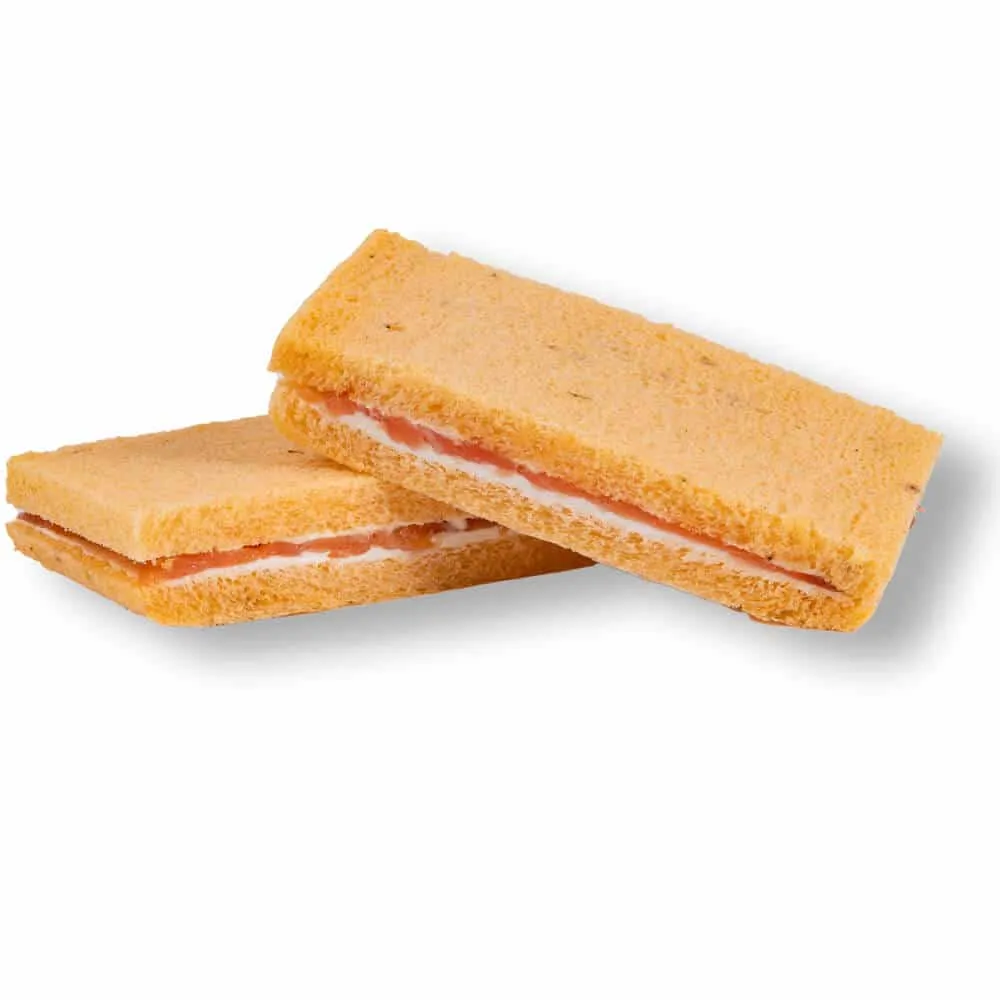 Disfruta de nuestro exquisito pan blanco relleno del mejor salmón ahumado acompañado de queso.