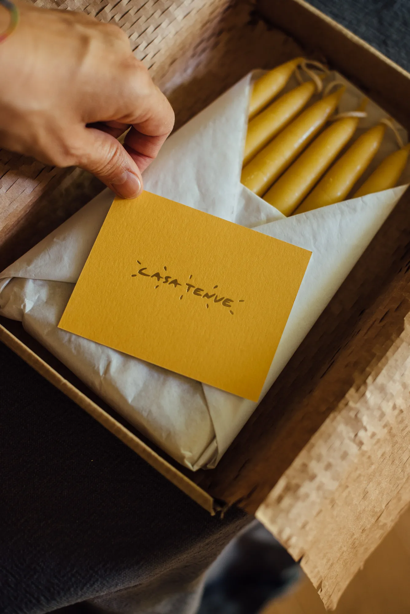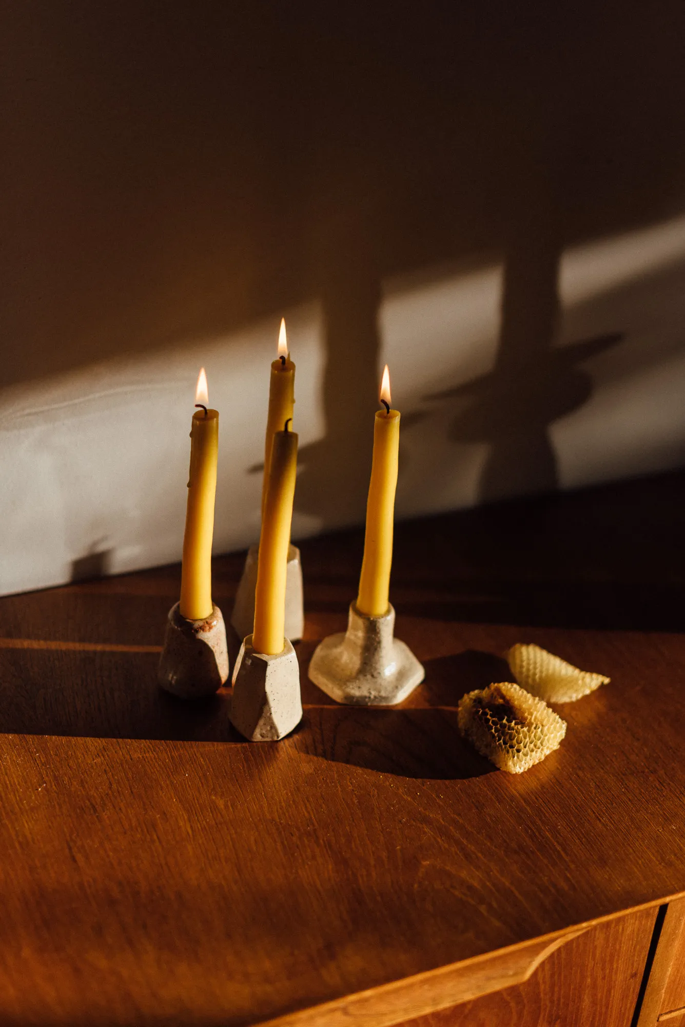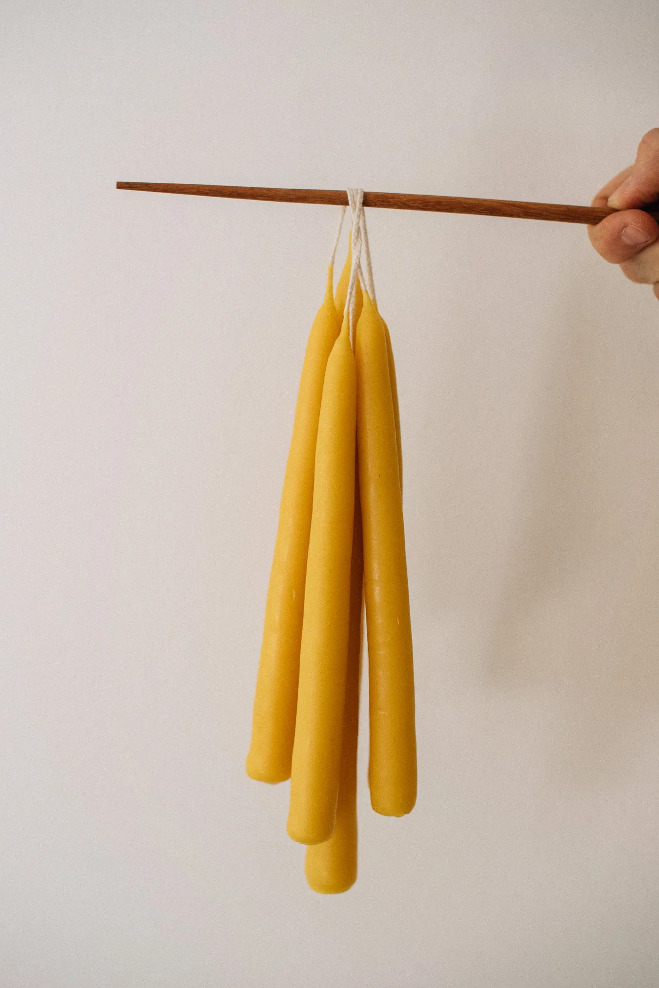 Velas de cera de abeja local y mecha de algodón.