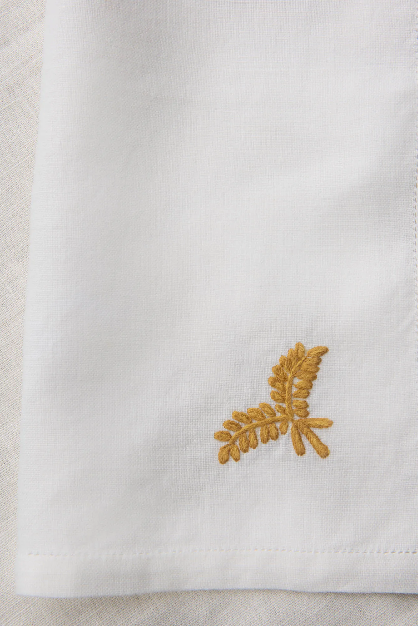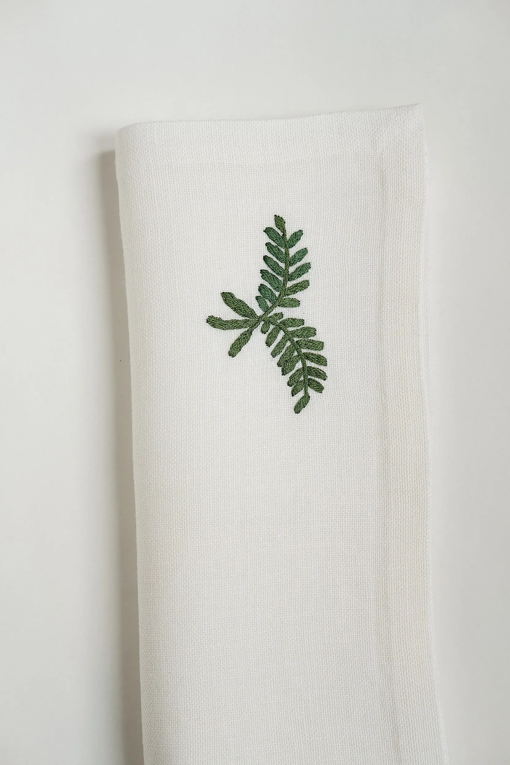 Servilletas de lino confeccionadas y bordadas a mano con el dibujo del helecho. Están inspiradas en la colección de cerámica de Talavera de la Reina de la serie de Helechos y Golondrinas (S XVII). Realizadas por artesanas de distintos pueblos de Toledo ( España).