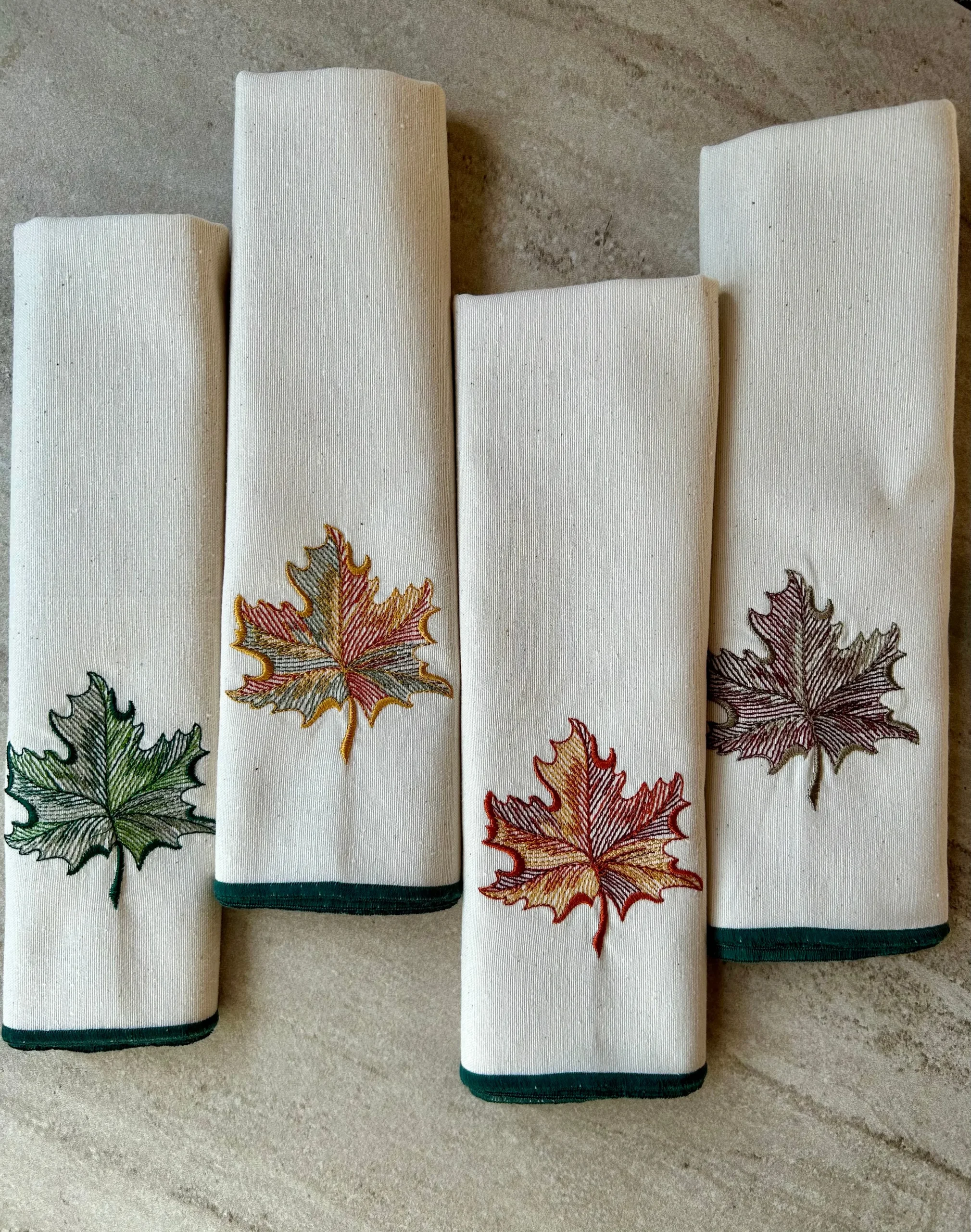 Juego de cuatro servilletas con el bordado de cuatro hojas, con el colorido del distinto paso de las estaciones. Originales de CUCA, colección de edición limitada.