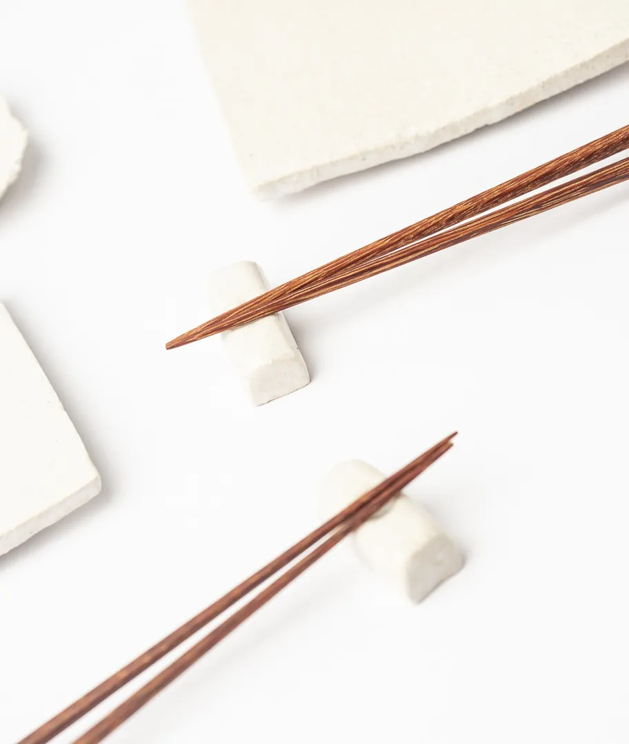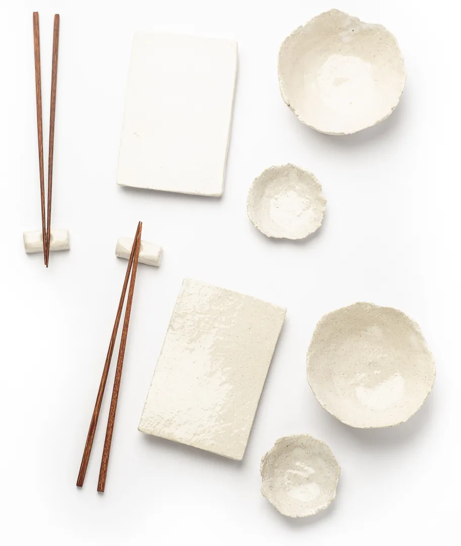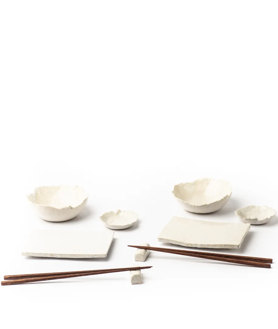 Kit de sushi realizado en gres blanco con palillos de madera hechos a mano.