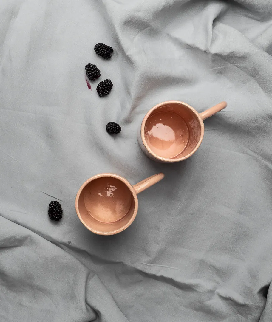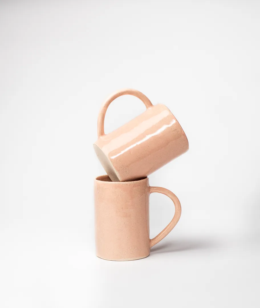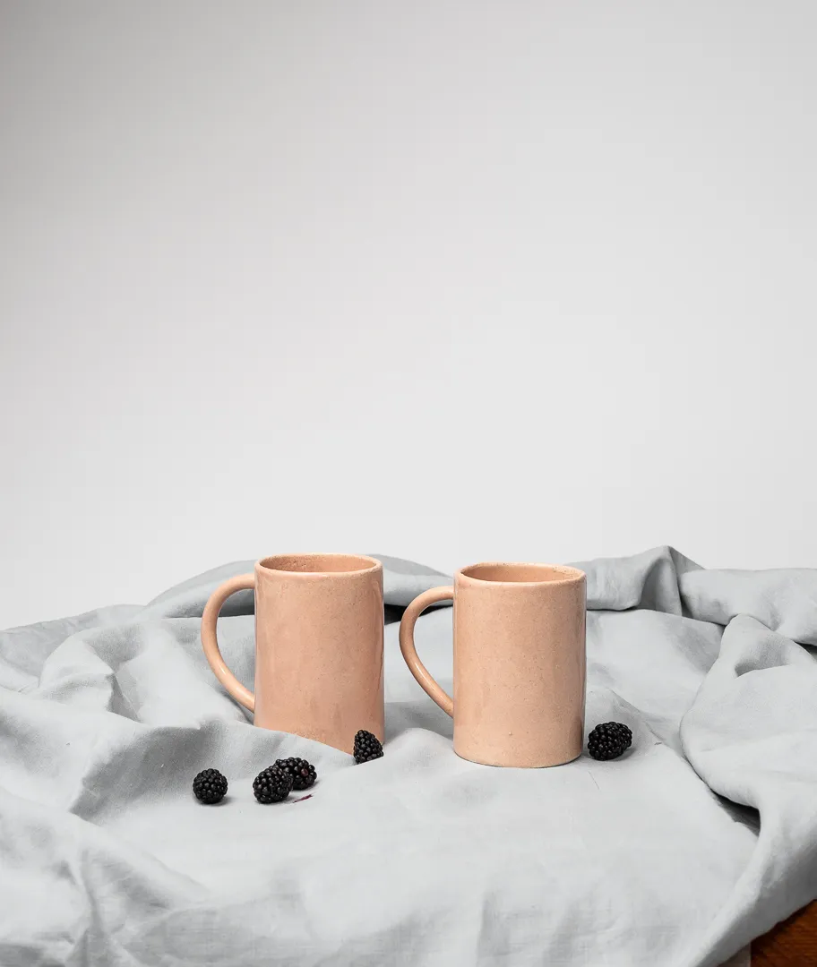 Dos tazas de desayuno en tono rosa pálido.