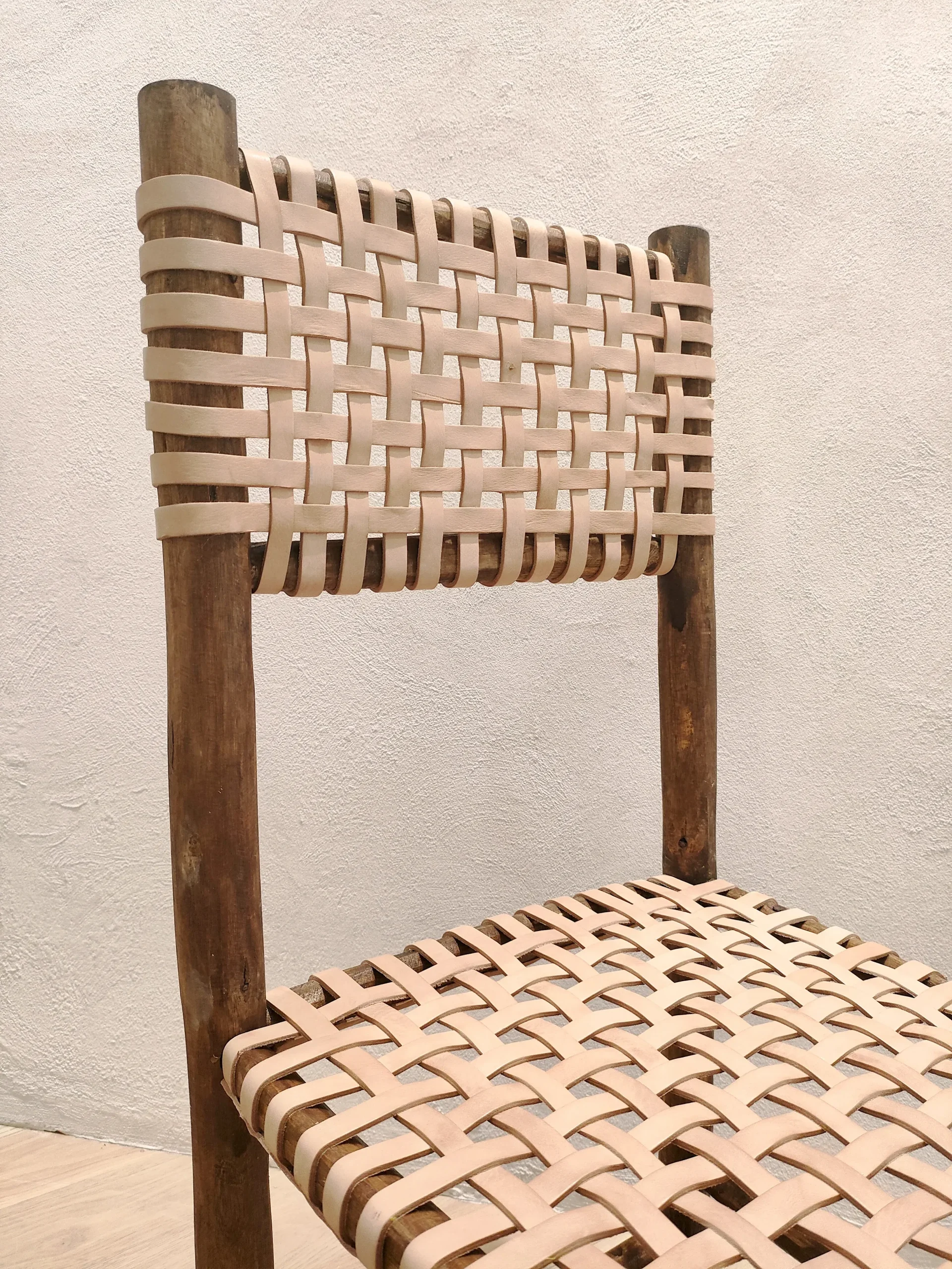 Las sillas Juana, reúnen todas las características propias de una silla de toda la vida. Con su estructura de madera, que mantiene un forma orgánica y artesanal, y el asiento y respaldo trenzado en piel. Todo realizado de manera artesanal.
