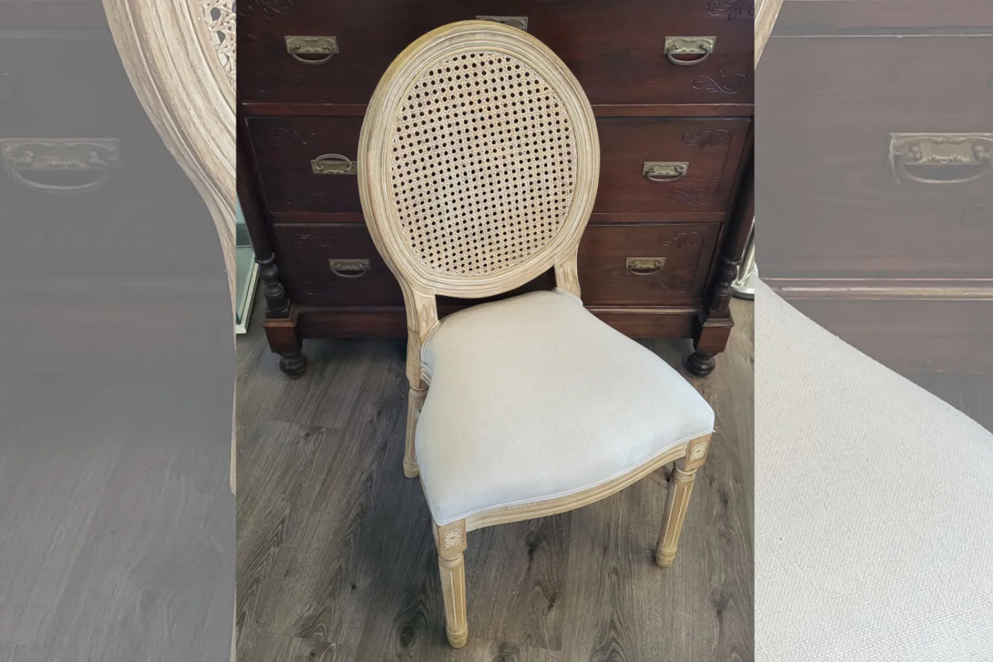 Silla Luis XVI Medallón Antique Ratán Silla Luis XVI medallón en madera de abedul macizo envejecido con cojín de lino beige desmontable y respaldo en medallón de ratán. Medidas; Altura : 97 cm Anchura : 47 cm Profundidad : 40 cm Respaldo: 48×40 cm.