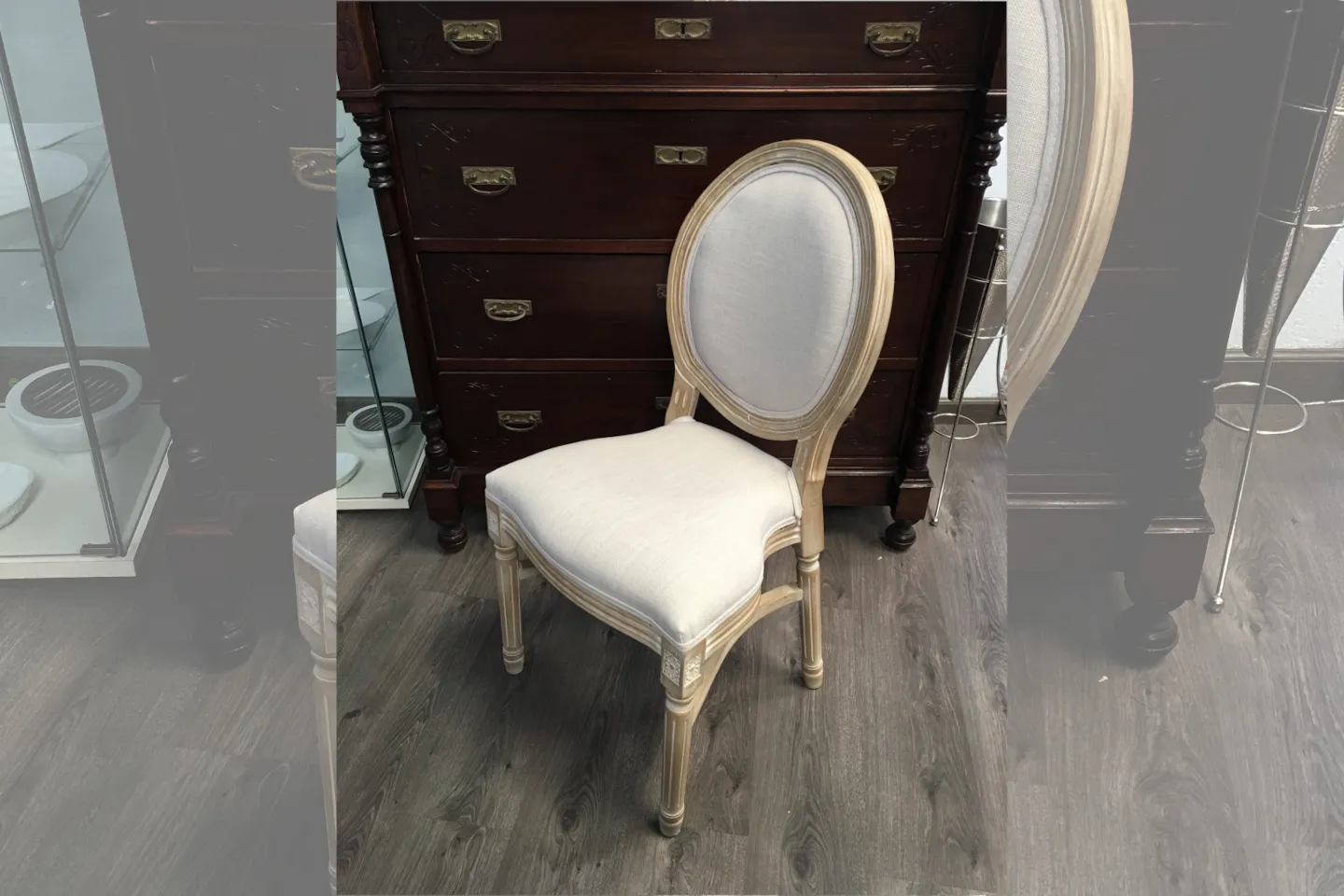 Silla Luis XVI, medidas 97x47x40 cm. Silla Luis XVI medallón en madera de abedul macizo decapado vintage de una sola pieza con cojín y respaldo medallón., color de tela , beige.