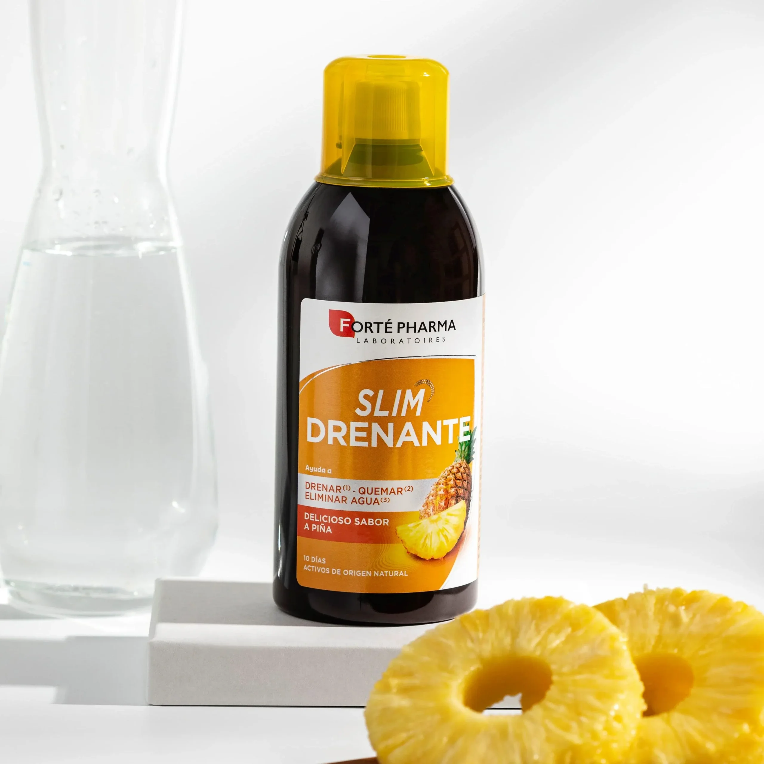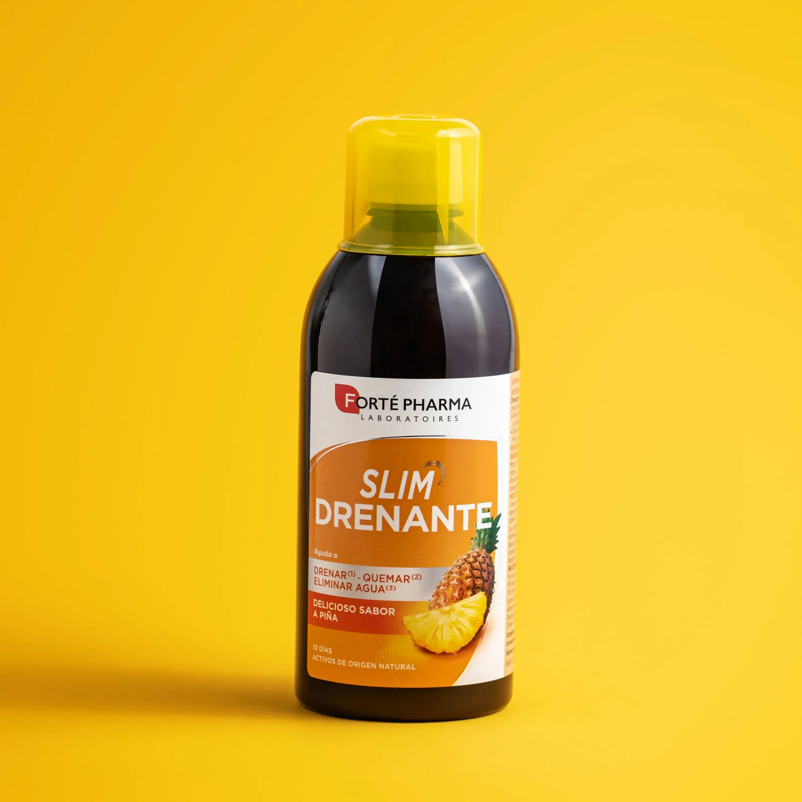 Slim drenante es un complemento alimenticio que asocia reina de los prados, hibiscos, rabillo de cereza, té verde y CactineaTM. El fitotrío de guayaba, alga aosa y ginseng completan la fórmula. Delicioso sabor a piña.