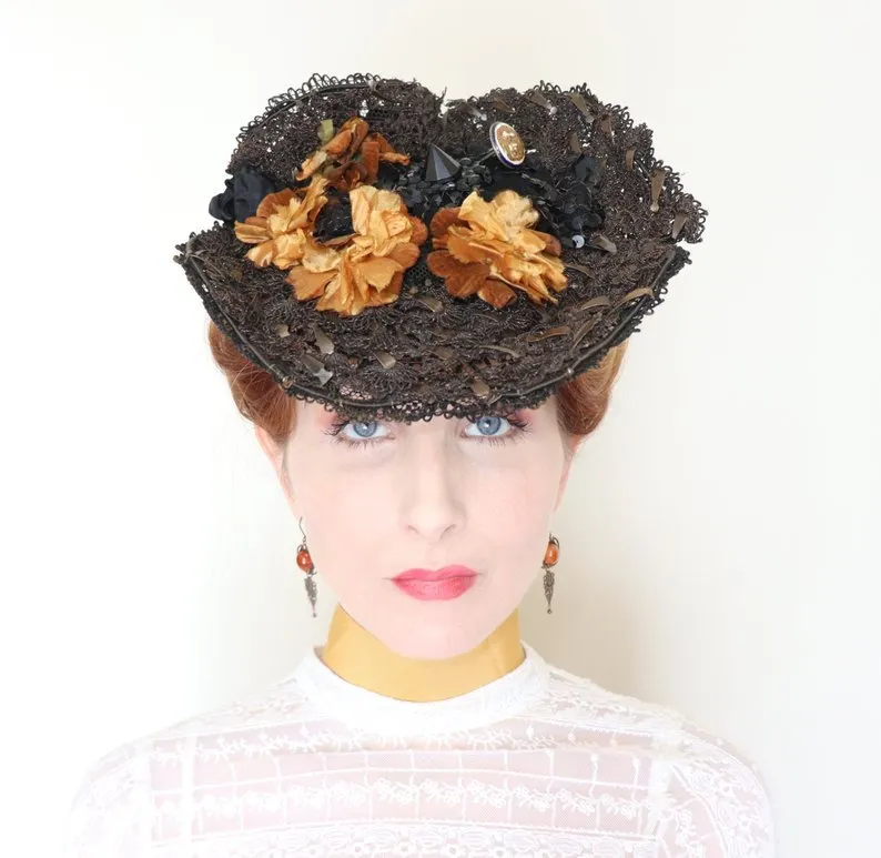 Es el tocado perfecto si quieres llevar una pieza victoriana original: ligero, con un diseño atemporal y unos materiales de lujo que sólo muestran una ligera pátina. Se lleva colocándolo sobre el peinado, así que no tendrás problemas de talla.