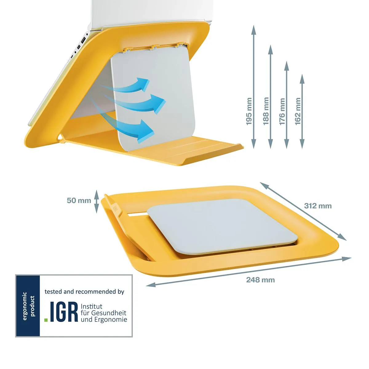 Soporte ajustable para ordenador portátil en atractivos colores y diseño minimalista, para uso en oficinas comerciales o domésticas, de la gama Leitz Cosy, que combina perfectamente con los tableros de escritura y accesorios de oficina de la misma gama.
