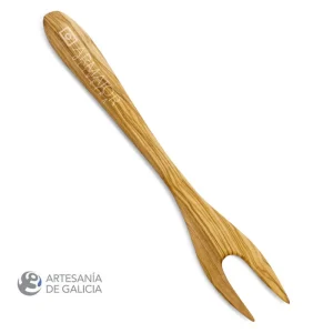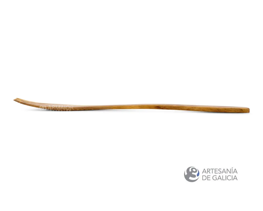 Tenedor hecho a mano en madera de olivo. Tenedor de servicio y cocina, con su clásica forma de horquilla en este caso de cuatro puntas, muy ligero y resistente. Un básico que no puede faltar en el cajón o en el bote de los cubiertos. Tanto para cocinar a diario como para servir en la mesa las fuentes con comida. Con todas las características que hacen de la madera de olivo una de las más recomendadas para usar en la cocina: