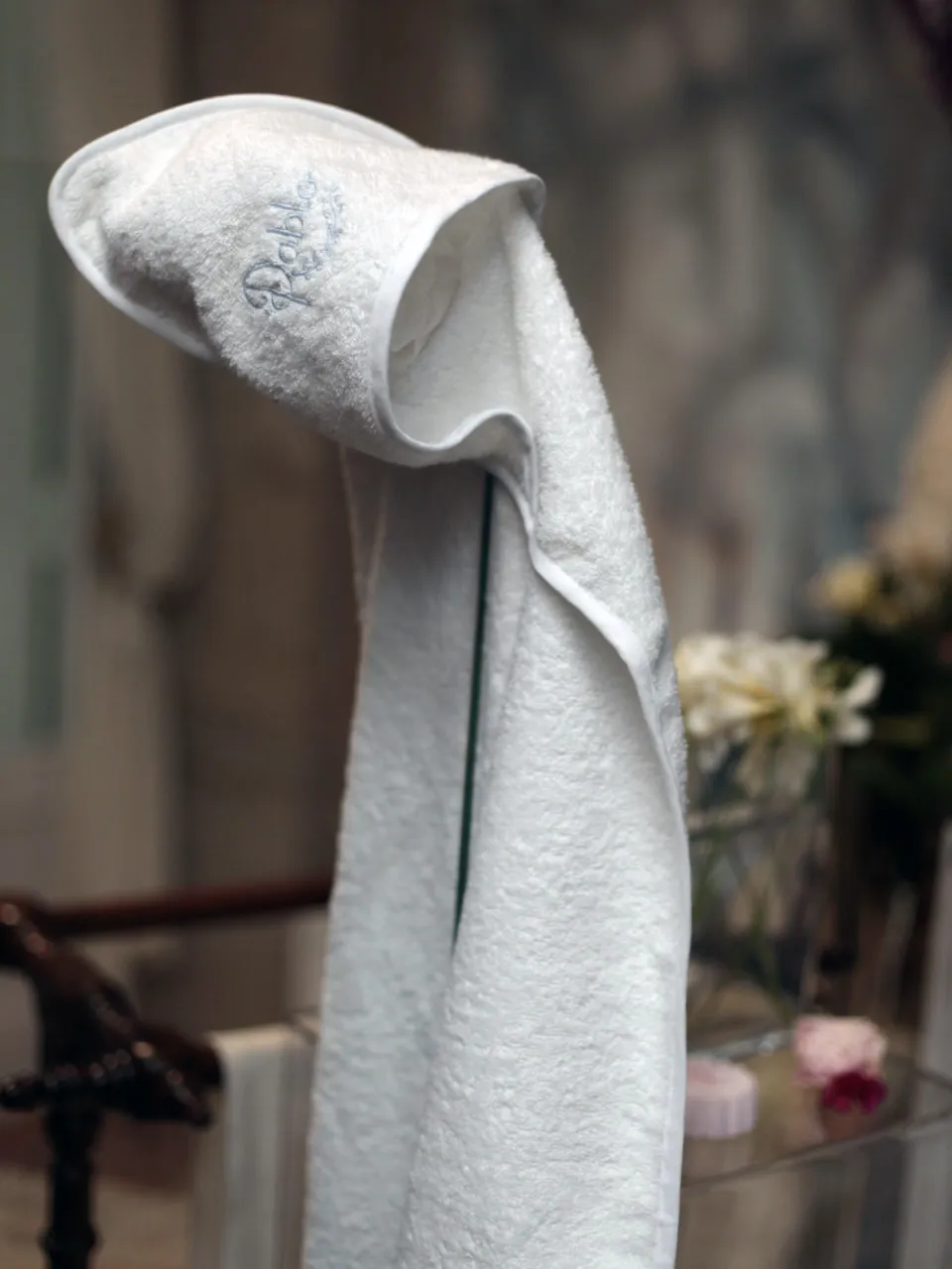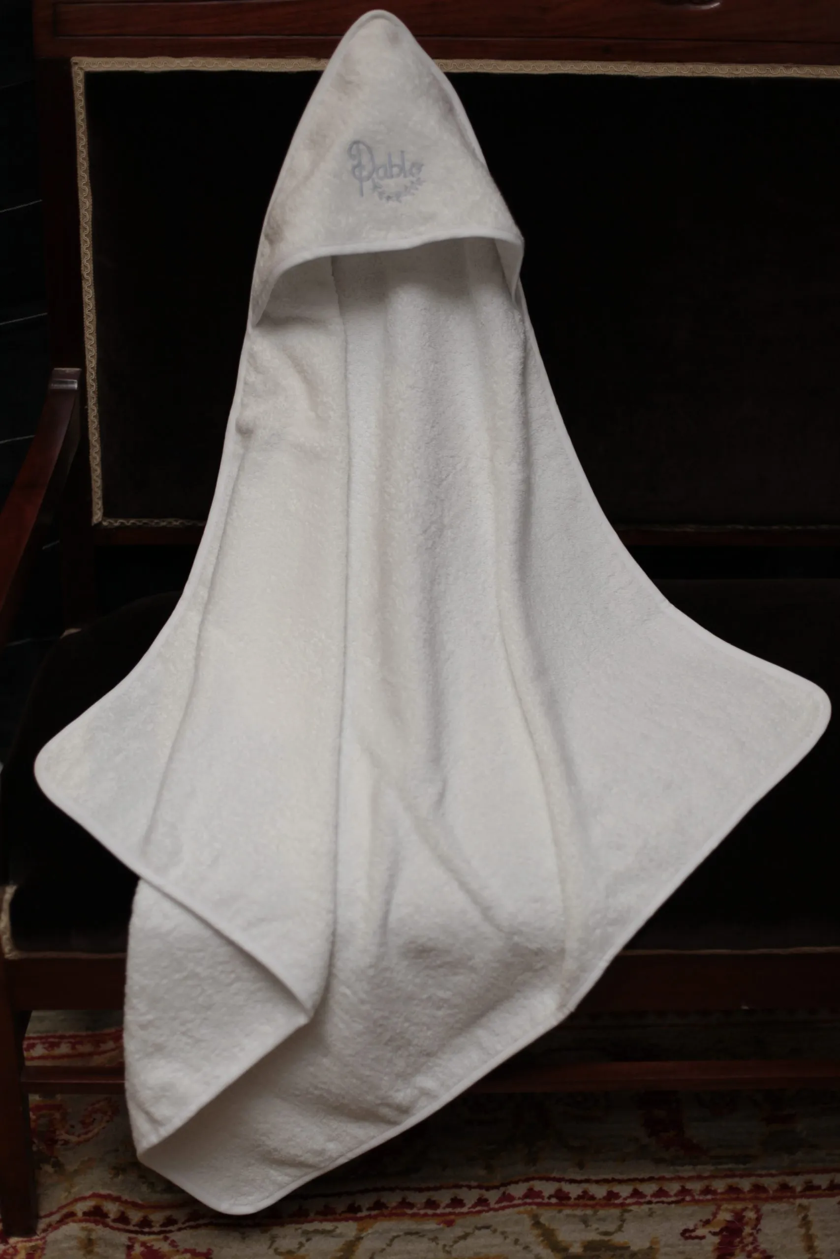 Hemos seleccionado esta toalla 100% algodón de alto gramaje para bordar de modo artesanal el nombre de Pablo con hilo de algodón color azul bebé .