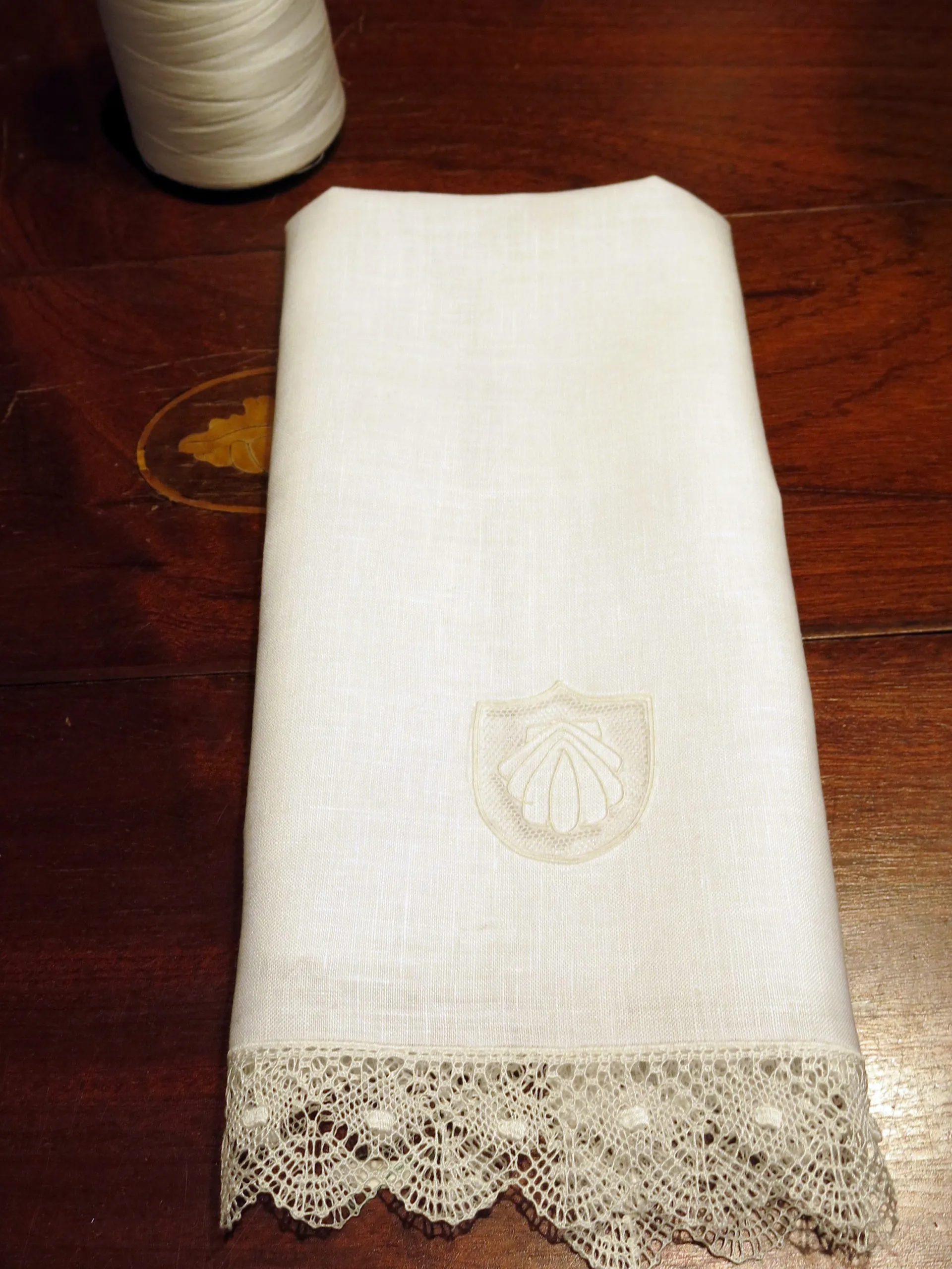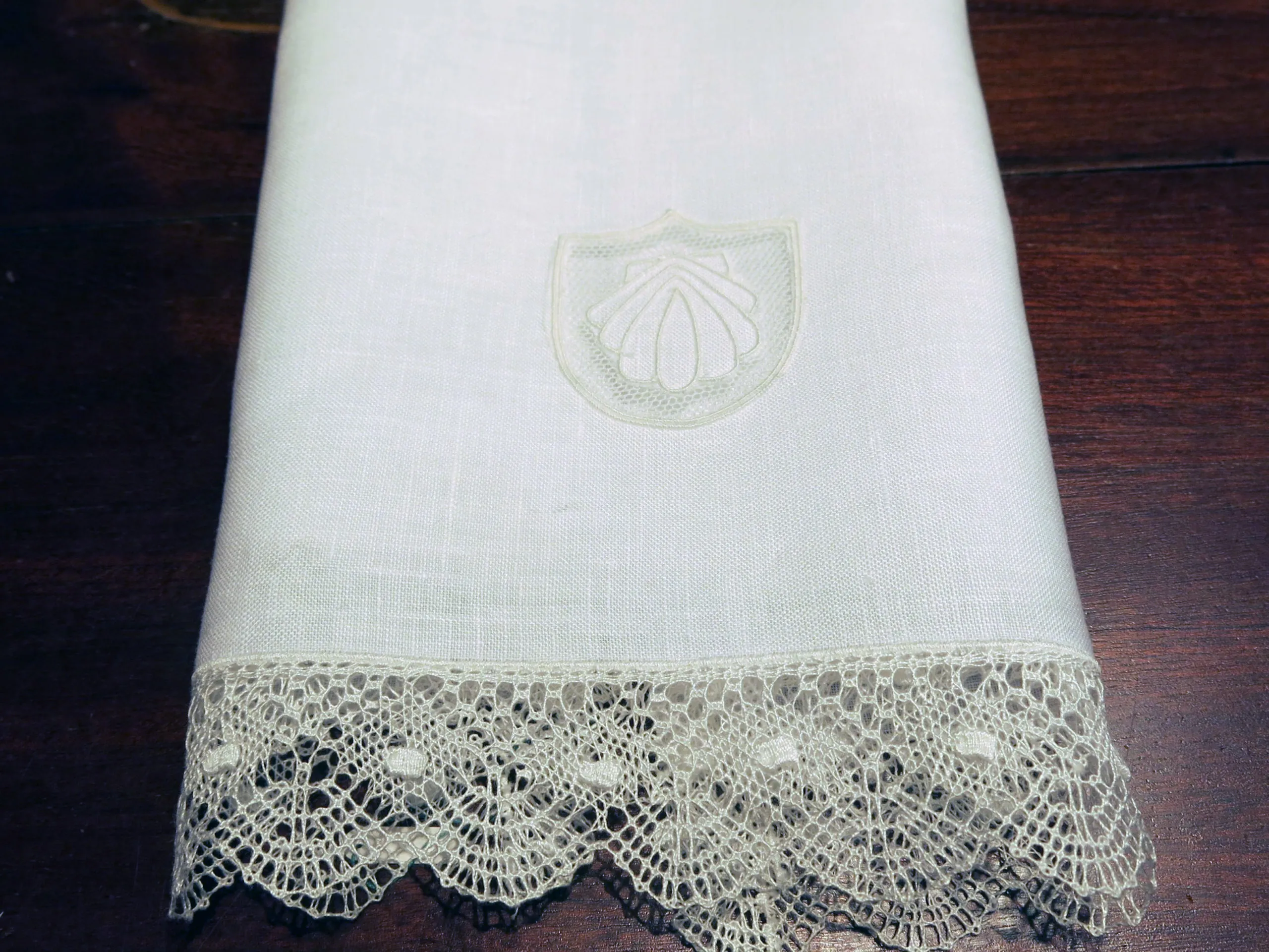 Elaborada en lino fino con vainicas hechas a mano y encaje de bolillos. Hemos elegido la concha como símbolo de bautizo, se puede personalizar y bordar el nombre.