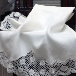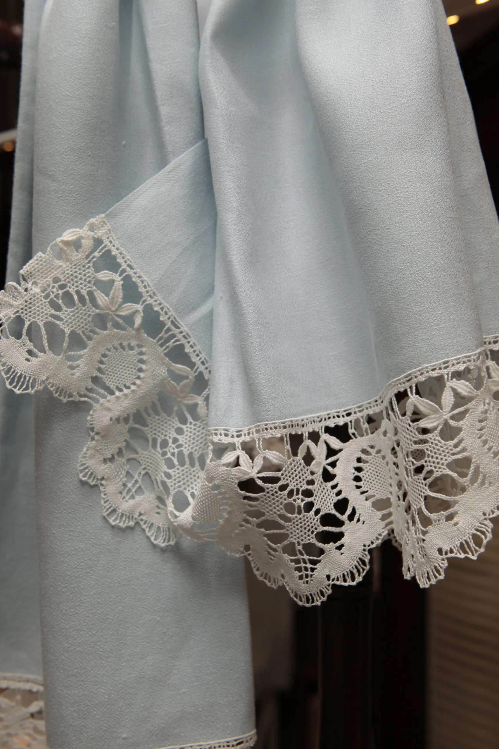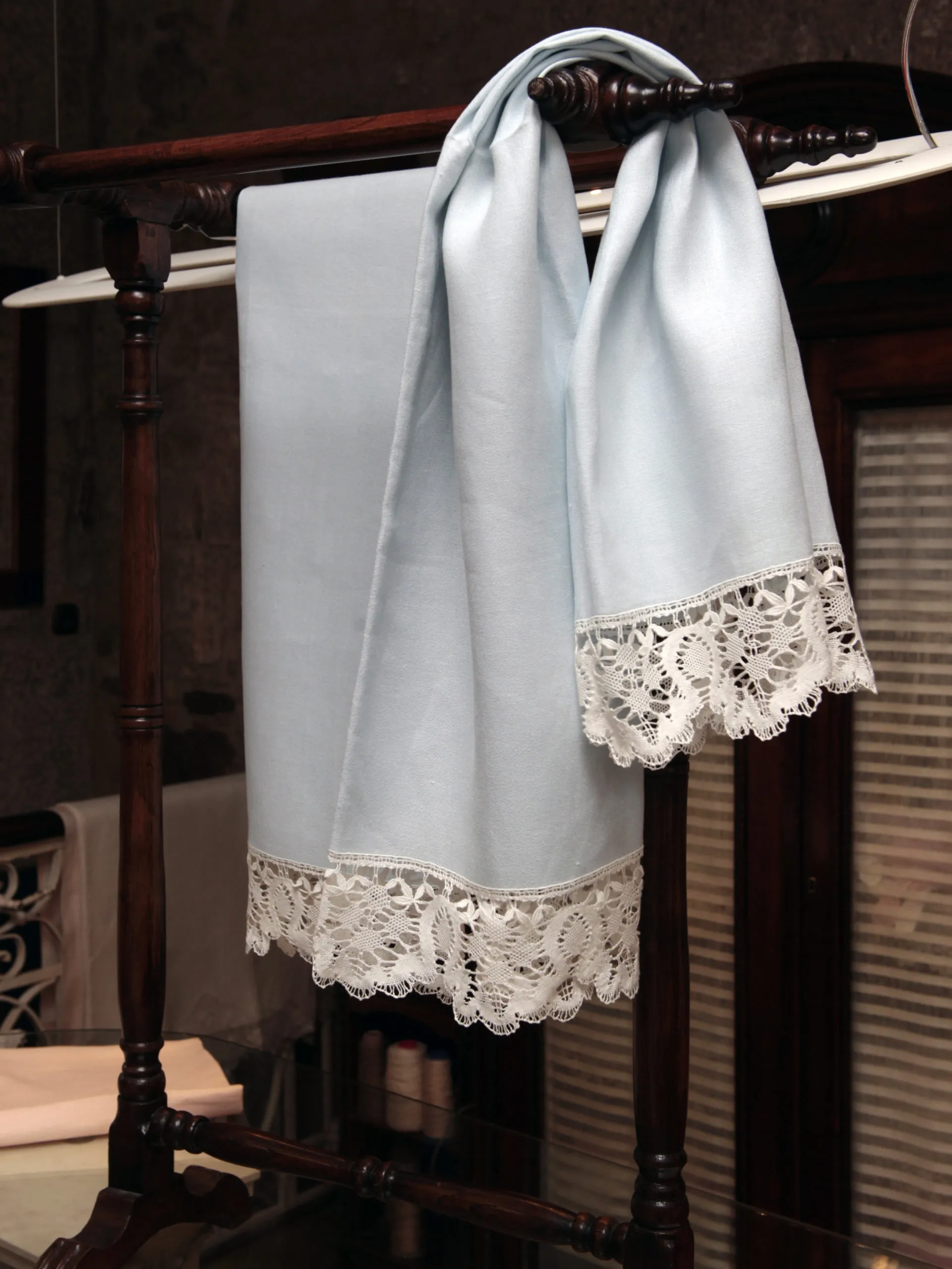 Toalla azúl de crepê de lino rematada con encaje de bolillos.
